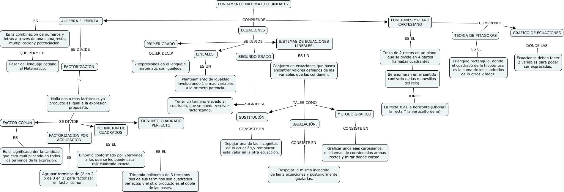 Este Cmap, tiene información relacionada con: FUNDAMENTO MATEMATICO, LINEALES ES UN Planteamiento de igualdad involucrando 1 o mas variables a la primera potencia., Es la combinacion de numeros y letras a traves de una suma,resta, multiplicaciony potenciacion. QUE PERMITE Pasar del lenguaje cotiano al Matematico., Halla dos o mas factotes cuyo producto es igual a la expresion propuesta. SE DIVIDE DEFINICION DE CUADRADOS, ALGEBRA ELEMENTAL ES Es la combinacion de numeros y letras a traves de una suma,resta, multiplicaciony potenciacion., Conjunto de ecuaciones que busca encontrar valores definidos de las variables que las contienen. TALES COMO SUSTITUCIÓN., GRAFICO DE ECUACIONES DONDE LAS Ecuaciones deben tener 2 variables para poder ser expresadas., ECUACIONES SE DIVIDE SEGUNDO GRADO, FACTORIZACION ES Halla dos o mas factotes cuyo producto es igual a la expresion propuesta., TEORIA DE PITAGORAS ES EL Triangulo rectangulo, donde el cuadrado de la hipotenusa es la suma de los cuadrados de lo otros 2 lados., Se enumeran en el sentido contrario de las manesillas del reloj. DONDE La recta X es la horizontal(Obcisa) la recta Y la vertical(ordena), PRIMER GRADO QUIER DECIR 2 expresiones en el lenguaje matematic son igualeds., FACTOR COMUN ES Es el significado der la cantidad que esta multiplicando en todos los terminos de la expresión., ALGEBRA ELEMENTAL SE DIVIDE FACTORIZACION, Trazo de 2 rectas en un plano que se divide en 4 partes llamadas cuadrantes ???? Se enumeran en el sentido contrario de las manesillas del reloj., FUNCIONES Y PLANO CARTESIANO COMPRENDE TEORIA DE PITAGORAS, IGUALACIÓN. CONSISTE EN Despejar la misma incognita de las 2 ecuaciones y posteriormente igualarlas., ECUACIONES SE DIVIDE SISTEMAS DE ECUACIONES LINEALES., SEGUNDO GRADO SIGNIFICA Tener un termino elevado al cuadrado, que se puede resolver factorizando., SISTEMAS DE ECUACIONES LINEALES. ES UN Conjunto de ecuaciones que busca encontrar valores definidos de las variables que las contienen., Conjunto de ecuaciones que busca encontrar valores definidos de las variables que las contienen. TALES COMO IGUALACIÓN.