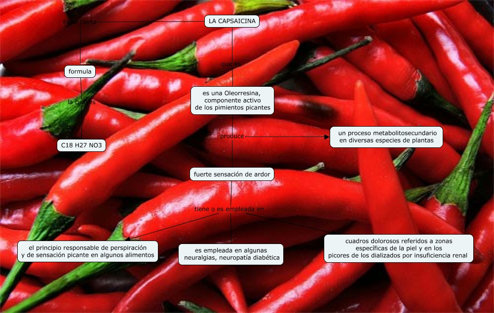 Este Cmap, tiene información relacionada con: jose castro, LA CAPSAICINA tiene cierta formula, fuerte sensación de ardor tiene o es empleada en el principio responsable de perspiración y de sensación picante en algunos alimentos, es una Oleorresina, componente activo de los pimientos picantes produce un proceso metabolitosecundario en diversas especies de plantas, fuerte sensación de ardor tiene o es empleada en es empleada en algunas neuralgias, neuropatía diabética, fuerte sensación de ardor tiene o es empleada en cuadros dolorosos referidos a zonas específicas de la piel y en los picores de los dializados por insuficiencia renal, formula la cual es C18 H27 NO3, LA CAPSAICINA que es es una Oleorresina, componente activo de los pimientos picantes, es una Oleorresina, componente activo de los pimientos picantes produce fuerte sensación de ardor