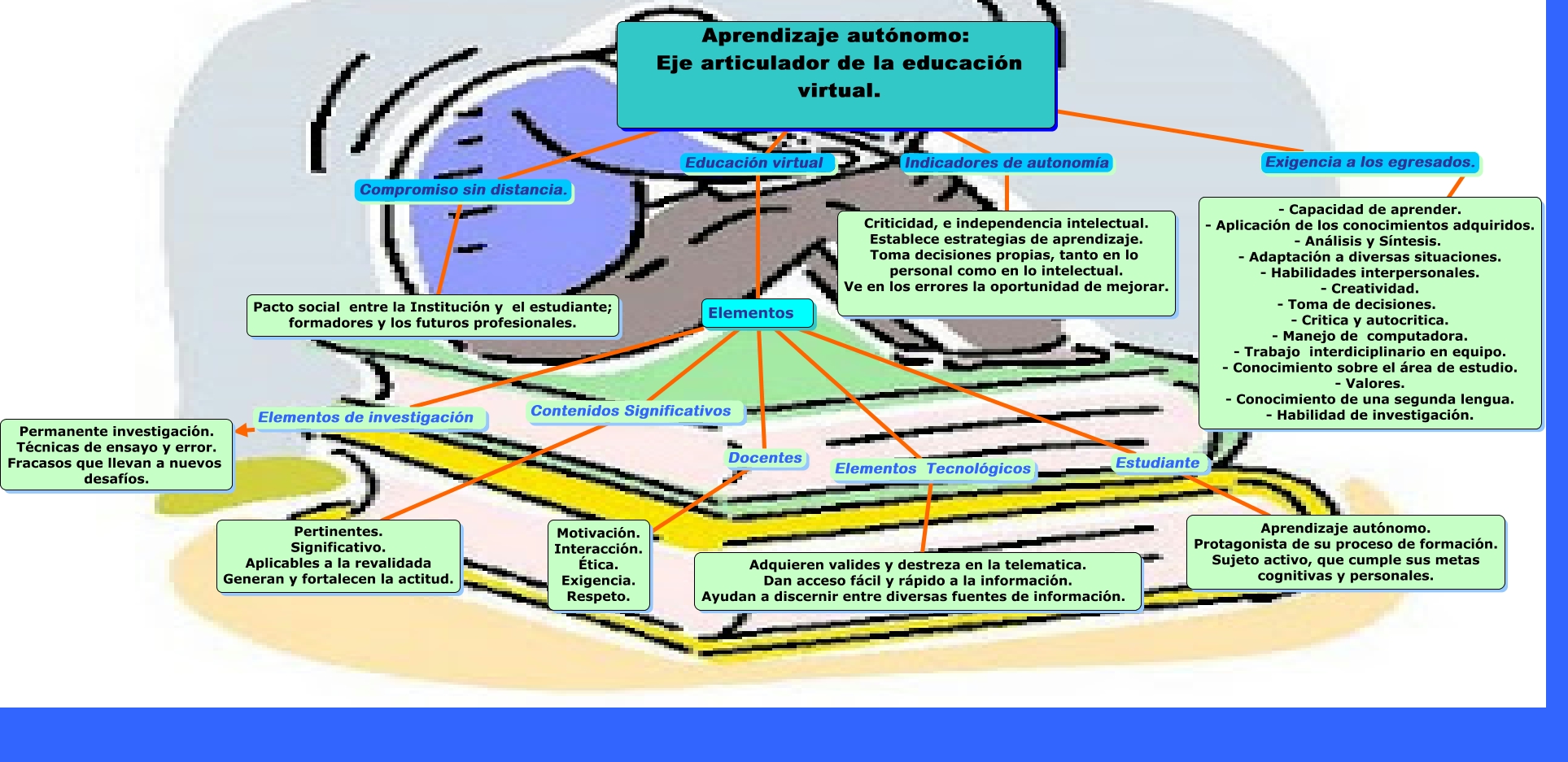 Este Cmap, tiene información relacionada con: Etapa 4, eje 3. Aprendizaje Autogestivo Yazmin Olvera, Elementos Estudiante Aprendizaje autónomo. Protagonista de su proceso de formación. Sujeto activo, que cumple sus metas cognitivas y personales., Elementos Elementos de investigación Permanente investigación. Técnicas de ensayo y error. Fracasos que llevan a nuevos desafíos., Aprendizaje autónomo: Eje articulador de la educación virtual. Indicadores de autonomía Criticidad, e independencia intelectual. Establece estrategias de aprendizaje. Toma decisiones propias, tanto en lo personal como en lo intelectual. Ve en los errores la oportunidad de mejorar., Elementos Docentes Motivación. Interacción. Ética. Exigencia. Respeto., Elementos Contenidos Significativos Pertinentes. Significativo. Aplicables a la revalidada Generan y fortalecen la actitud., Aprendizaje autónomo: Eje articulador de la educación virtual. Educación virtual Elementos, Aprendizaje autónomo: Eje articulador de la educación virtual. Exigencia a los egresados. - Capacidad de aprender. - Aplicación de los conocimientos adquiridos. - Análisis y Síntesis. - Adaptación a diversas situaciones. - Habilidades interpersonales. - Creatividad. - Toma de decisiones. - Critica y autocritica. - Manejo de computadora. - Trabajo interdiciplinario en equipo. - Conocimiento sobre el área de estudio. - Valores. - Conocimiento de una segunda lengua. - Habilidad de investigación., Elementos Elementos Tecnológicos Adquieren valides y destreza en la telematica. Dan acceso fácil y rápido a la información. Ayudan a discernir entre diversas fuentes de información., Aprendizaje autónomo: Eje articulador de la educación virtual. Compromiso sin distancia. Pacto social entre la Institución y el estudiante; formadores y los futuros profesionales.