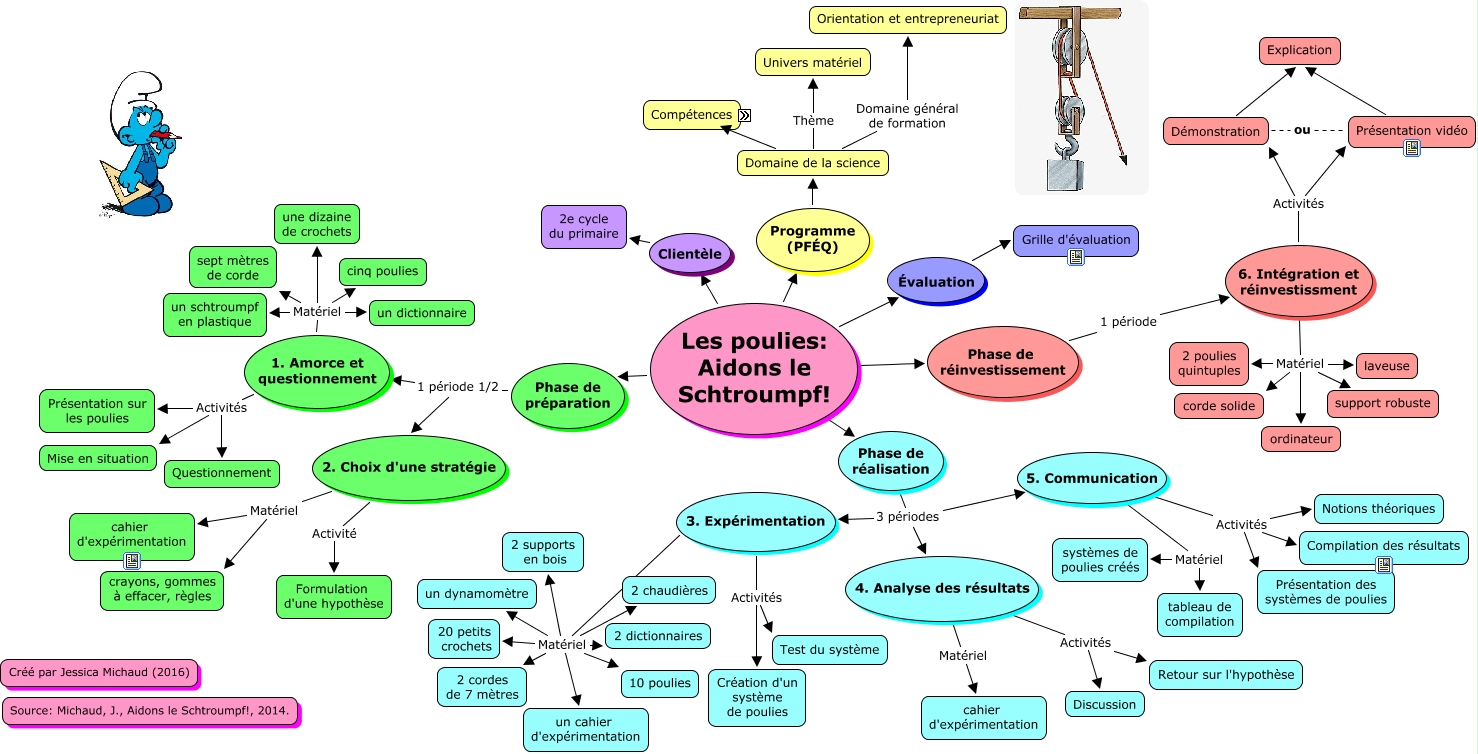 Cette carte de concepts créée avec IHMC CmapTools traite de: Michaud_Jessica_TP4.cmap, Les poulies: Aidons le Schtroumpf! Évaluation, Les poulies: Aidons le Schtroumpf! Phase de réalisation, 2. Choix d'une stratégie Matériel crayons, gommes à effacer, règles, 3. Expérimentation Matériel un cahier d'expérimentation, Les poulies: Aidons le Schtroumpf! Phase de préparation, 2. Choix d'une stratégie Activité Formulation d'une hypothèse, 6. Intégration et réinvestissment Matériel ordinateur, Les poulies: Aidons le Schtroumpf! Clientèle, Domaine de la science Thème Univers matériel, 3. Expérimentation Matériel 2 supports en bois, 1. Amorce et questionnement Matériel sept mètres de corde, Phase de préparation 1 période 1/2 1. Amorce et questionnement, 5. Communication Activités Notions théoriques, 3. Expérimentation Activités Création d'un système de poulies, 6. Intégration et réinvestissment Matériel corde solide, 3. Expérimentation Matériel 2 chaudières, 6. Intégration et réinvestissment Matériel support robuste, Phase de réalisation 3 périodes 5. Communication, 1. Amorce et questionnement Matériel un schtroumpf en plastique, 3. Expérimentation Matériel un dynamomètre