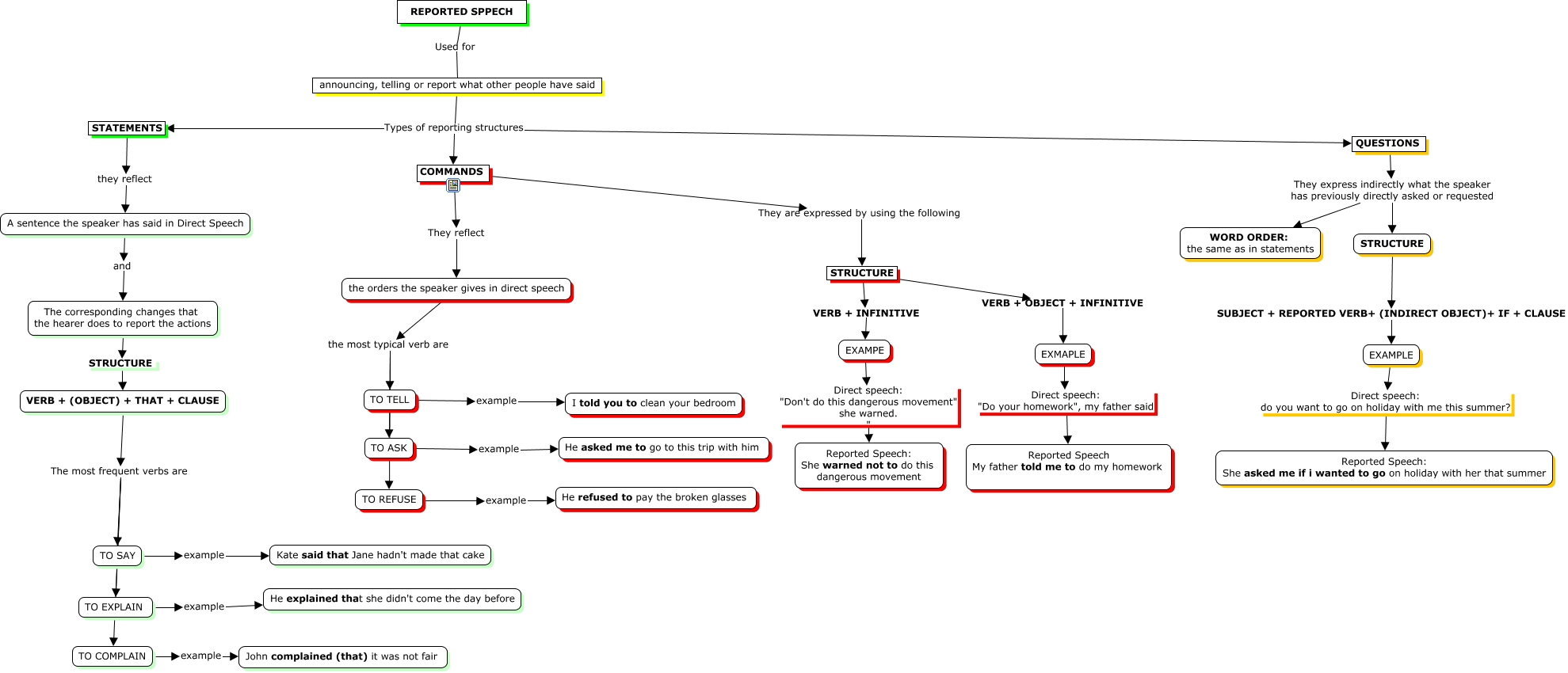Este Cmap, tiene información relacionada con: REPORTED SPEECH, A sentence the speaker has said in Direct Speech and The corresponding changes that the hearer does to report the actions, QUESTIONS They express indirectly what the speaker has previously directly asked or requested WORD ORDER: the same as in statements, the orders the speaker gives in direct speech the most typical verb are TO REFUSE, STRUCTURE SUBJECT + REPORTED VERB+ (INDIRECT OBJECT)+ IF + CLAUSE EXAMPLE, QUESTIONS They express indirectly what the speaker has previously directly asked or requested STRUCTURE, TO EXPLAIN example He explained that she didn't come the day before, TO REFUSE example He refused to pay the broken glasses, COMMANDS They reflect the orders the speaker gives in direct speech, EXAMPE Direct speech: "Don't do this dangerous movement" she warned. " Reported Speech: She warned not to do this dangerous movement, TO COMPLAIN example John complained (that) it was not fair, announcing, telling or report what other people have said Types of reporting structures COMMANDS, VERB + (OBJECT) + THAT + CLAUSE The most frequent verbs are TO SAY, TO TELL example I told you to clean your bedroom, STRUCTURE VERB + OBJECT + INFINITIVE EXMAPLE, EXMAPLE Direct speech: "Do your homework", my father said Reported Speech My father told me to do my homework, TO SAY example Kate said that Jane hadn't made that cake, the orders the speaker gives in direct speech the most typical verb are TO ASK, STATEMENTS they reflect A sentence the speaker has said in Direct Speech, the orders the speaker gives in direct speech the most typical verb are TO TELL, COMMANDS They are expressed by using the following STRUCTURE