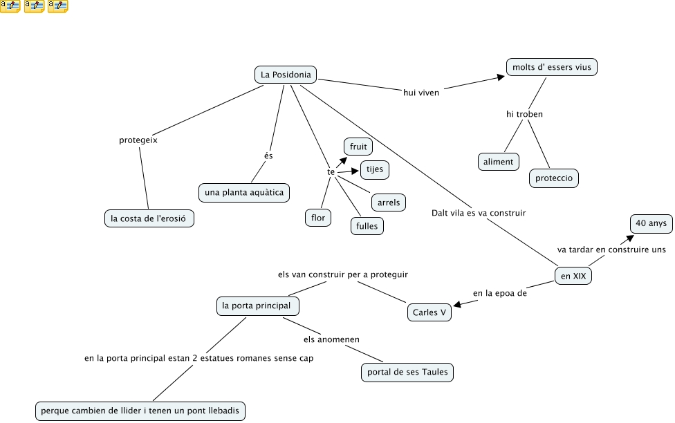 Aquest mapa conceptual conté informació relacionada amb: posidonia, La Posidonia te tijes, La Posidonia protegeix la costa de l'erosió, la porta principal els anomenen portal de ses Taules, La Posidonia te arrels, La Posidonia hui viven molts d' essers vius, Carles V els van construir per a proteguir la porta principal, la porta principal en la porta principal estan 2 estatues romanes sense cap perque cambien de llider i tenen un pont llebadis, en XIX en la epoa de Carles V, La Posidonia te fulles, en XIX va tardar en construire uns 40 anys, molts d' essers vius hi troben proteccio, La Posidonia Dalt vila es va construir en XIX, molts d' essers vius hi troben aliment, La Posidonia te fruit, La Posidonia te flor, La Posidonia és una planta aquàtica