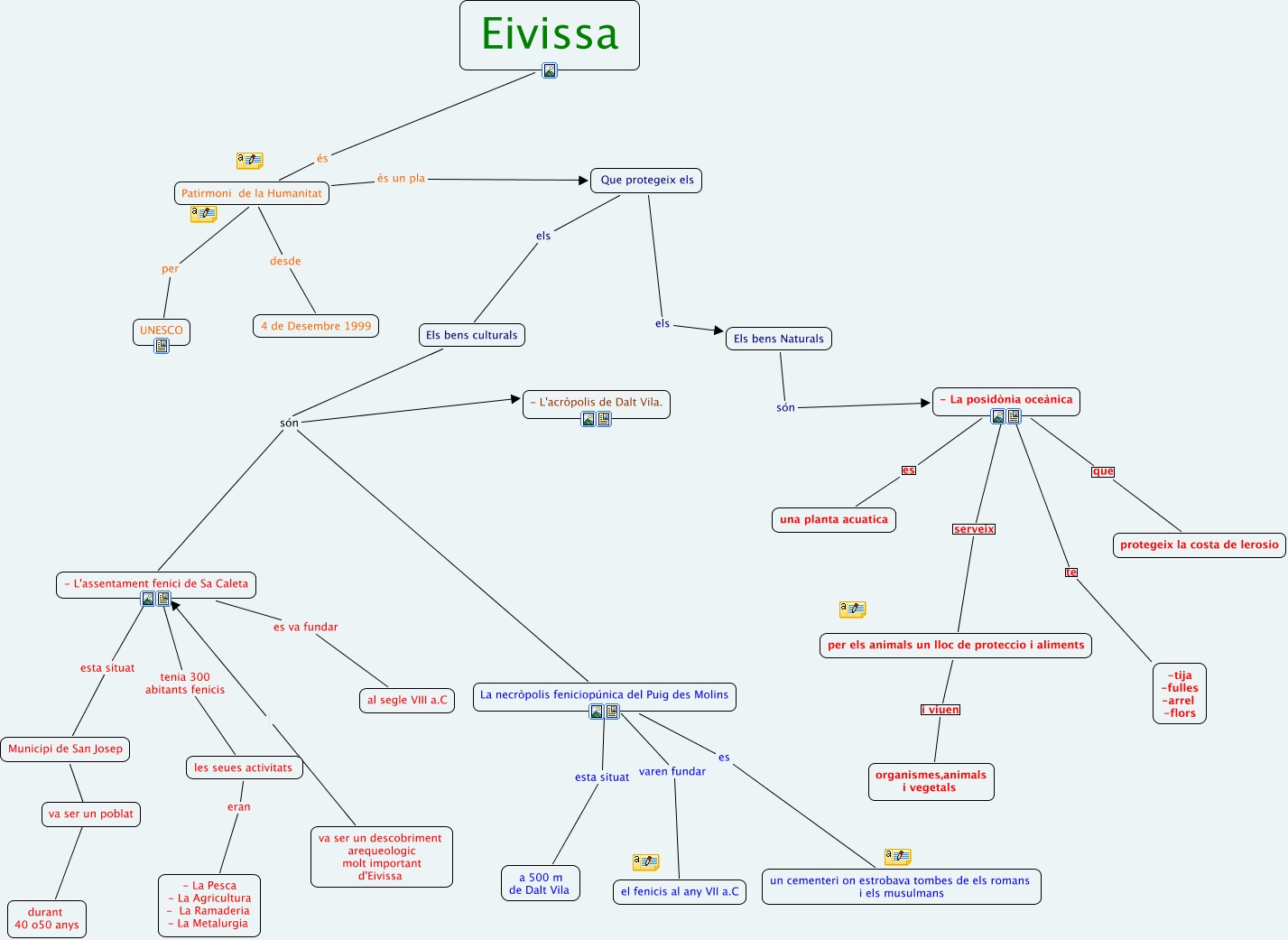 Aquest mapa conceptual conté informació relacionada amb: Patrimoni Humanitat_moad, les seues activitats eran - La Pesca - La Agricultura - La Ramaderia - La Metalurgia, Que protegeix els els Els bens Naturals, Patirmoni de la Humanitat desde 4 de Desembre 1999, Patirmoni de la Humanitat és un pla Que protegeix els, - La posidònia oceànica es una planta acuatica, La necròpolis feniciopúnica del Puig des Molins són - L'assentament fenici de Sa Caleta, va ser un descobriment arequeologic molt important d'Eivissa - L'assentament fenici de Sa Caleta, Municipi de San Josep v durant 40 o50 anys, Els bens culturals són - L'assentament fenici de Sa Caleta, La necròpolis feniciopúnica del Puig des Molins es un cementeri on estrobava tombes de els romans i els musulmans, Que protegeix els els Els bens culturals, La necròpolis feniciopúnica del Puig des Molins varen fundar el fenicis al any VII a.C, - La posidònia oceànica que protegeix la costa de lerosio, per els animals un lloc de proteccio i aliments i viuen organismes,animals i vegetals, La necròpolis feniciopúnica del Puig des Molins esta situat a 500 m de Dalt Vila, - La posidònia oceànica te -tija -fulles -arrel -flors, - La posidònia oceànica serveix per els animals un lloc de proteccio i aliments, Els bens culturals són - L'acròpolis de Dalt Vila., - L'assentament fenici de Sa Caleta tenia 300 abitants fenicis les seues activitats, Els bens Naturals són - La posidònia oceànica