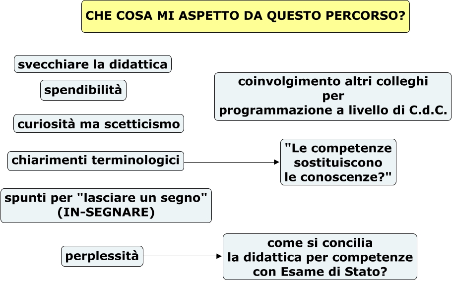 Questa Cmap, creata con IHMC CmapTools, contiene informazioni relative a: raccolta aspettative, perplessità ???? come si concilia la didattica per competenze con Esame di Stato?, chiarimenti terminologici ???? "Le competenze sostituiscono le conoscenze?"