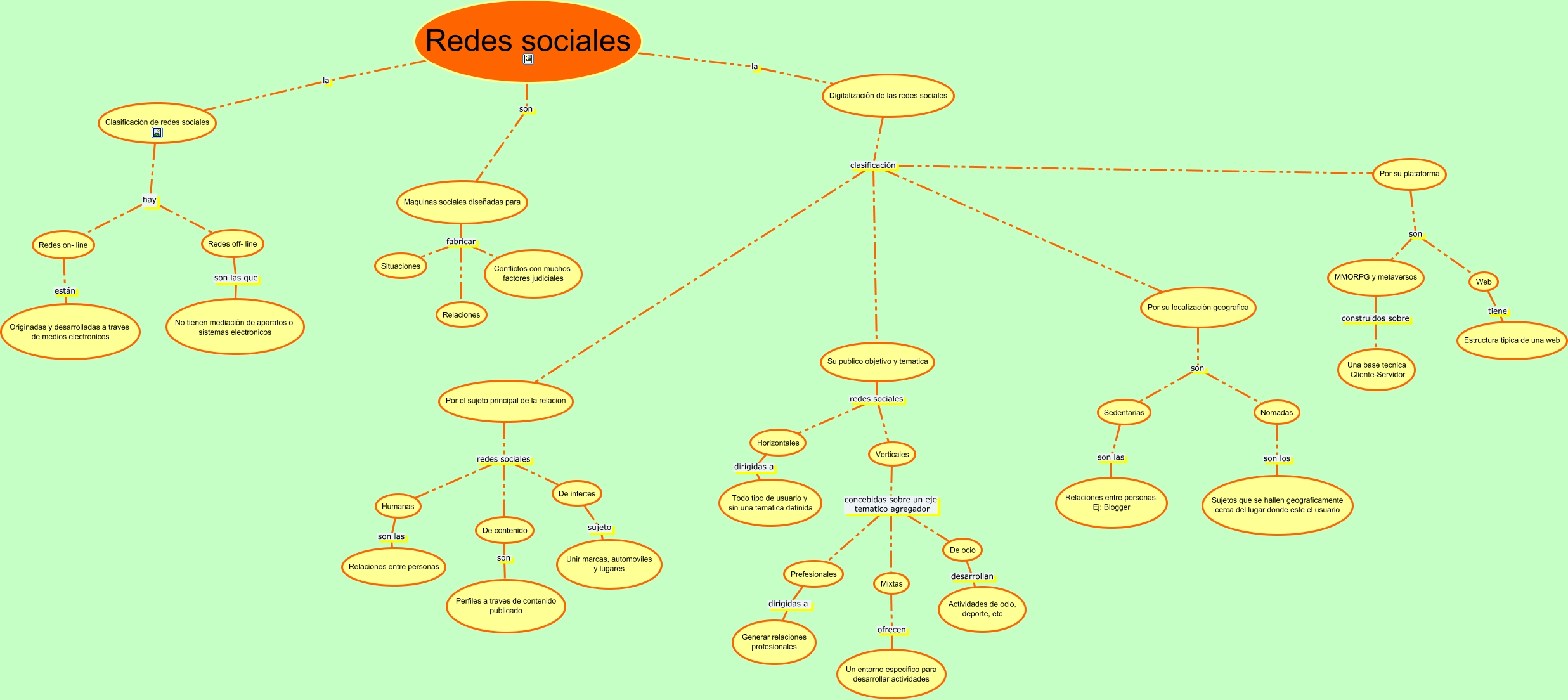 Este Cmap, tiene información relacionada con: Red, Por su localización geografica son Nomadas, De ocio desarrollan Actividades de ocio, deporte, etc, Mixtas ofrecen Un entorno especifico para desarrollar actividades, Redes off- line son las que No tienen mediación de aparatos o sistemas electronicos, Su publico objetivo y tematica redes sociales Verticales, Digitalización de las redes sociales clasificación Por su plataforma, Por su plataforma son Web, MMORPG y metaversos construidos sobre Una base tecnica Cliente-Servidor, Humanas son las Relaciones entre personas, Verticales concebidas sobre un eje tematico agregador Mixtas, Digitalización de las redes sociales clasificación Su publico objetivo y tematica, Sedentarias son las Relaciones entre personas. Ej: Blogger, Redes on- line están Originadas y desarrolladas a traves de medios electronicos, Por su plataforma son MMORPG y metaversos, Digitalización de las redes sociales clasificación Por su localización geografica, Maquinas sociales diseñadas para fabricar Conflictos con muchos factores judiciales, Web tiene Estructura tipica de una web, Su publico objetivo y tematica redes sociales Horizontales, Redes sociales la Clasificación de redes sociales, Nomadas son los Sujetos que se hallen geograficamente cerca del lugar donde este el usuario