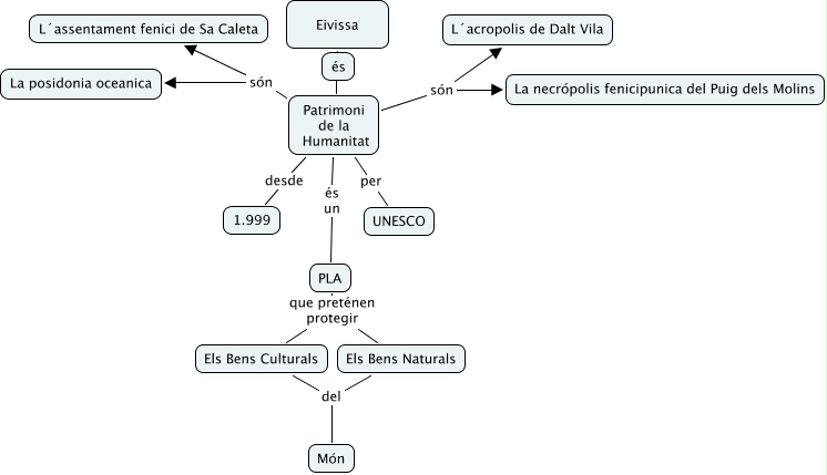Aquest mapa conceptual conté informació relacionada amb: Sense títol 3, Patrimoni de la Humanitat són L´acropolis de Dalt Vila, Patrimoni de la Humanitat és un PLA, Patrimoni de la Humanitat són L´assentament fenici de Sa Caleta, Patrimoni de la Humanitat són La necrópolis fenicipunica del Puig dels Molins, Patrimoni de la Humanitat per UNESCO, Patrimoni de la Humanitat desde 1.999, Patrimoni de la Humanitat són La posidonia oceanica, Els Bens Naturals del Món, PLA que preténen protegir Els Bens Culturals, PLA que preténen protegir Els Bens Naturals, Els Bens Culturals del Món, Eivissa Patrimoni de la Humanitat