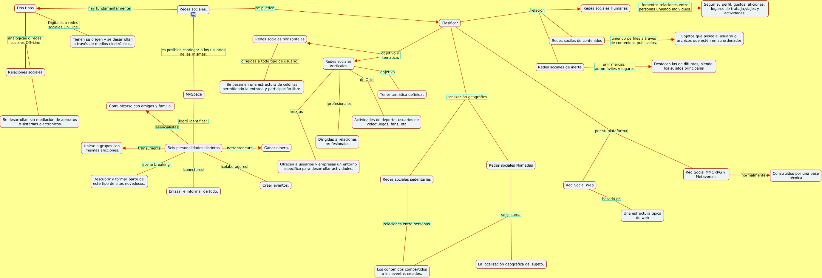 Este Cmap, tiene información relacionada con: Redes sociales, Seis personalidades distintas scene breaking Descubrir y formar parte de este tipo de sites novedosos., Clasificar objetivo y tematica. Redes sociales horizontales, Dos tipos analogicas o redes sociales Off-Line Se desarrollan sin mediación de aparatos o sistemas electronicos., Redes sociales Verticales de Ocio Actividades de deporte, usuarios de videojuegos, fans, etc., Seis personalidades distintas transumerrs Unirse a grupos con mismas aficciones., Seis personalidades distintas netrepreneurs Ganar dinero., Seis personalidades distintas esencialistas Comunicarse con amigos y familia., Clasificar por su plataforma Red Social MMORPG y Metaversos, Clasificar por su plataforma Red Social Web, Redes sociales Nómadas se le suma La localización geográfica del sujeto., Dos tipos Digitales o redes sociales On-Line. Tienen su origen y se desarrollan a través de medios electrónicos., Seis personalidades distintas colaboradores Crear eventos., Redes sociales Verticales profesionales Dirigidas a relaciones profesionales., Red Social Web basada en Una estructura tipica de web, Clasificar localización geográfica Redes sociales Nómadas, Clasificar relación Redes sociales de inerte, Redes sociales Humanas fomentar relaciones entre personas uniendo individuos. Según su perfil, gustos, aficiones, lugares de trabajo,viajes y actividades., Clasificar relación Redes sociles de contenidos, MySpace logró identificar Seis personalidades distintas, Redes sociales Verticales mixtas Ofrecen a usuarios y empresas un entorno específico para desarrollar actividades.