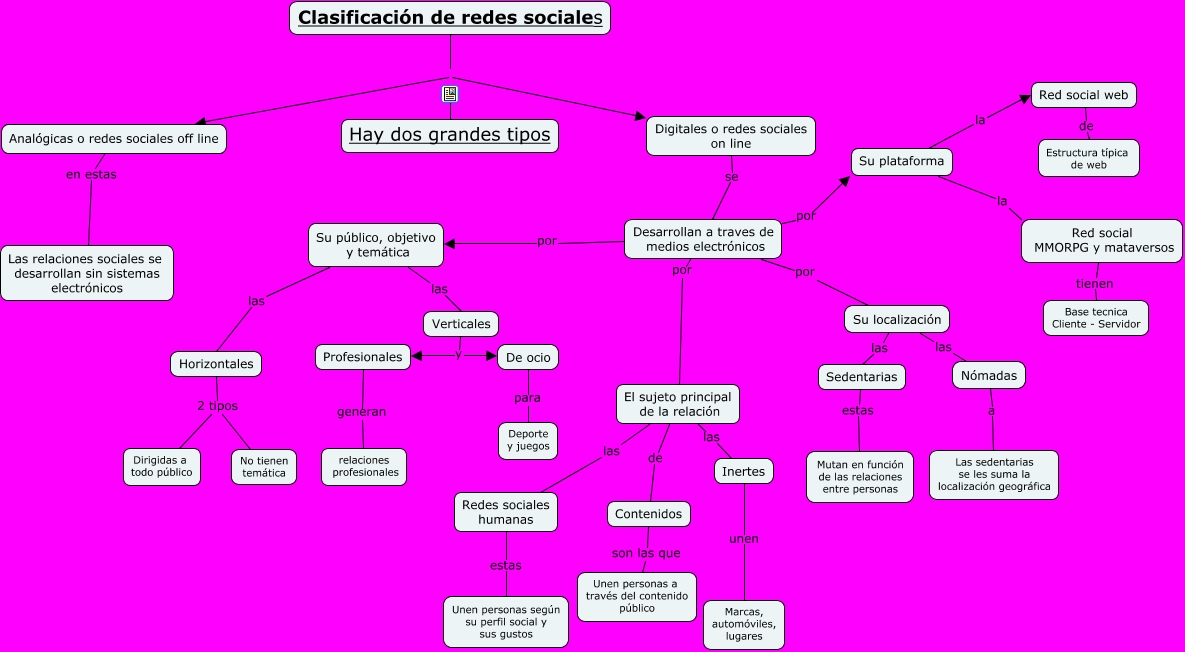 Este Cmap, tiene información relacionada con: redes sociales, Profesionales generan relaciones profesionales, Su plataforma la Red social web, Inertes unen Marcas, automóviles, lugares, El sujeto principal de la relación las Inertes, Desarrollan a traves de medios electrónicos por El sujeto principal de la relación, De ocio para Deporte y juegos, Red social MMORPG y mataversos tienen Base tecnica Cliente - Servidor, Su localización las Nómadas, Sedentarias estas Mutan en función de las relaciones entre personas, Desarrollan a traves de medios electrónicos por Su localización, Horizontales 2 tipos Dirigidas a todo público, Redes sociales humanas estas Unen personas según su perfil social y sus gustos, Su localización las Sedentarias, Su plataforma la Red social MMORPG y mataversos, Su público, objetivo y temática las Horizontales, Clasificación de redes sociales Digitales o redes sociales on line, Su público, objetivo y temática las Verticales, Analógicas o redes sociales off line en estas Las relaciones sociales se desarrollan sin sistemas electrónicos, Clasificación de redes sociales Analógicas o redes sociales off line, Verticales y Profesionales