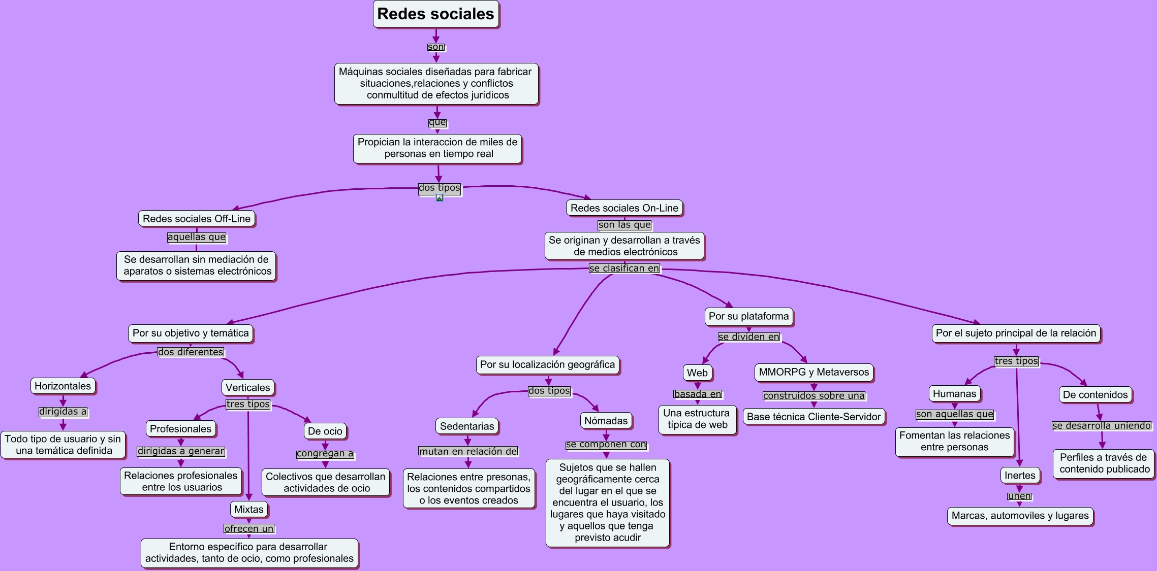 Este Cmap, tiene información relacionada con: Redes sociales asensio, Se originan y desarrollan a través de medios electrónicos se clasifican en Por su plataforma, Se originan y desarrollan a través de medios electrónicos se clasifican en Por su objetivo y temática, Profesionales dirigidas a generar Relaciones profesionales entre los usuarios, Humanas son aquellas que Fomentan las relaciones entre personas, Horizontales dirigidas a Todo tipo de usuario y sin una temática definida, Nómadas se componen con Sujetos que se hallen geográficamente cerca del lugar en el que se encuentra el usuario, los lugares que haya visitado y aquellos que tenga previsto acudir, Redes sociales Off-Line aquellas que Se desarrollan sin mediación de aparatos o sistemas electrónicos, Máquinas sociales diseñadas para fabricar situaciones,relaciones y conflictos conmultitud de efectos jurídicos que Propician la interaccion de miles de personas en tiempo real, Sedentarias mutan en relación de Relaciones entre presonas, los contenidos compartidos o los eventos creados, Por el sujeto principal de la relación tres tipos Humanas, Web basada en Una estructura típica de web, Por su localización geográfica dos tipos Sedentarias, Por su objetivo y temática dos diferentes Horizontales, Verticales tres tipos De ocio, Propician la interaccion de miles de personas en tiempo real dos tipos Redes sociales Off-Line, Redes sociales son Máquinas sociales diseñadas para fabricar situaciones,relaciones y conflictos conmultitud de efectos jurídicos, Por su plataforma se dividen en MMORPG y Metaversos, Redes sociales On-Line son las que Se originan y desarrollan a través de medios electrónicos, MMORPG y Metaversos construidos sobre una Base técnica Cliente-Servidor, Por su plataforma se dividen en Web