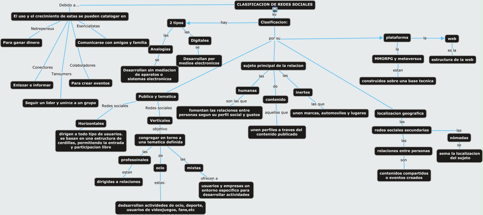 Este Cmap, tiene información relacionada con: clasificacion de redes sociales, Analogias se Desarrollan sin mediacion de aparatos o sistemas electronicos, Digitales se Desarrollan por medios electronicos, sujeto principal de la relacion las inertes, localizacion geografica por su sujeto principal de la relacion, web es la estructura de la web, Clasificacion: por su plataforma, El uso y el crecimiento de estas se pueden catalogar en Conectores Enlazar e informar, sujeto principal de la relacion de contenido, congregar en torno a una tematica definida las profesoinales, localizacion geografica las redes sociales secundarias, plataforma la MMORPG y metaversus, El uso y el crecimiento de estas se pueden catalogar en Tansumers Seguir un lider y unirce a un grupo, 2 tipos las Digitales, congregar en torno a una tematica definida las mixtas, Clasificacion: por su sujeto principal de la relacion, relaciones entre personas son contenidos compartidos o eventos creados, Horizontales se dirigen a todo tipo de usuarios. se basan en una estructura de cerdillas, permitiendo la entrada y participacion libre, mixtas ofrecen a usuarios y empresas un entorno especifico para desarrollar actividades, profesoinales estan dirigidas a relaciones, Clasificacion: hay 2 tipos