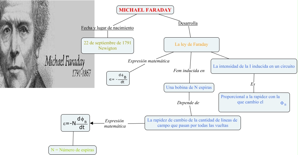 Este Cmap, tiene información relacionada con: Michael Faraday, La ley de Faraday Expresión matemática <math xmlns="http://www.w3.org/1998/Math/MathML"> <mrow> <mtext> ∈= - </mtext> <mfrac> <mrow> <mtext> d </mtext> <mmultiscripts> <mtext> ϕ </mtext> <mtext> B </mtext> <none/> </mmultiscripts> </mrow> <mtext> dt </mtext> </mfrac> </mrow> </math>, La intensidad de la I inducida en un circuito Es <math xmlns="http://www.w3.org/1998/Math/MathML"> <mrow> <mtext> Proporcional a la rapidez con la