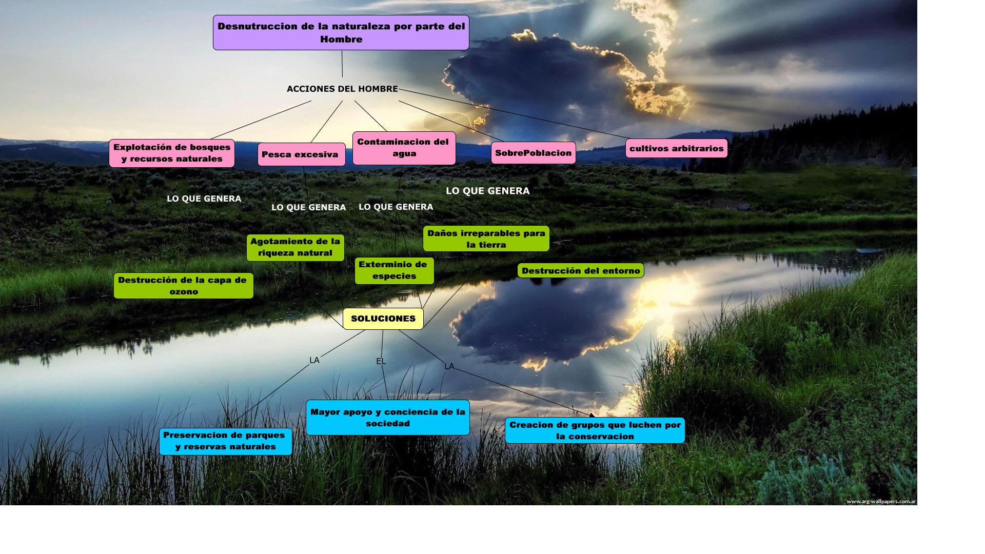 Este Cmap, tiene información relacionada con: MAPA CONCEPTUAL 2 DESTRUCCION DE LA NATURALEZA POR PARTE DEL HOMBRE, Contaminacion del agua LO QUE GENERA SOLUCIONES, SobrePoblacion LO QUE GENERA SOLUCIONES, SOLUCIONES EL Mayor apoyo y conciencia de la sociedad, Explotación de bosques y recursos naturales ACCIONES DEL HOMBRE Contaminacion del agua, cultivos arbitrarios LO QUE GENERA Destrucción del entorno, Pesca excesiva LO QUE GENERA SOLUCIONES, cultivos arbitrarios ACCIONES DEL HOMBRE Contaminacion del agua, Pesca excesiva LO QUE GENERA Agotamiento de la riqueza natural, Explotación de bosques y recursos naturales LO QUE GENERA SOLUCIONES, Desnutruccion de la naturaleza por parte del Hombre ACCIONES DEL HOMBRE Contaminacion del agua, Contaminacion del agua LO QUE GENERA Exterminio de especies, cultivos arbitrarios LO QUE GENERA SOLUCIONES, SobrePoblacion ACCIONES DEL HOMBRE Contaminacion del agua, SobrePoblacion LO QUE GENERA Daños irreparables para la tierra, SOLUCIONES LA Creacion de grupos que luchen por la conservacion, Explotación de bosques y recursos naturales LO QUE GENERA Destrucción de la capa de ozono, Pesca excesiva ACCIONES DEL HOMBRE Contaminacion del agua, SOLUCIONES LA Preservacion de parques y reservas naturales