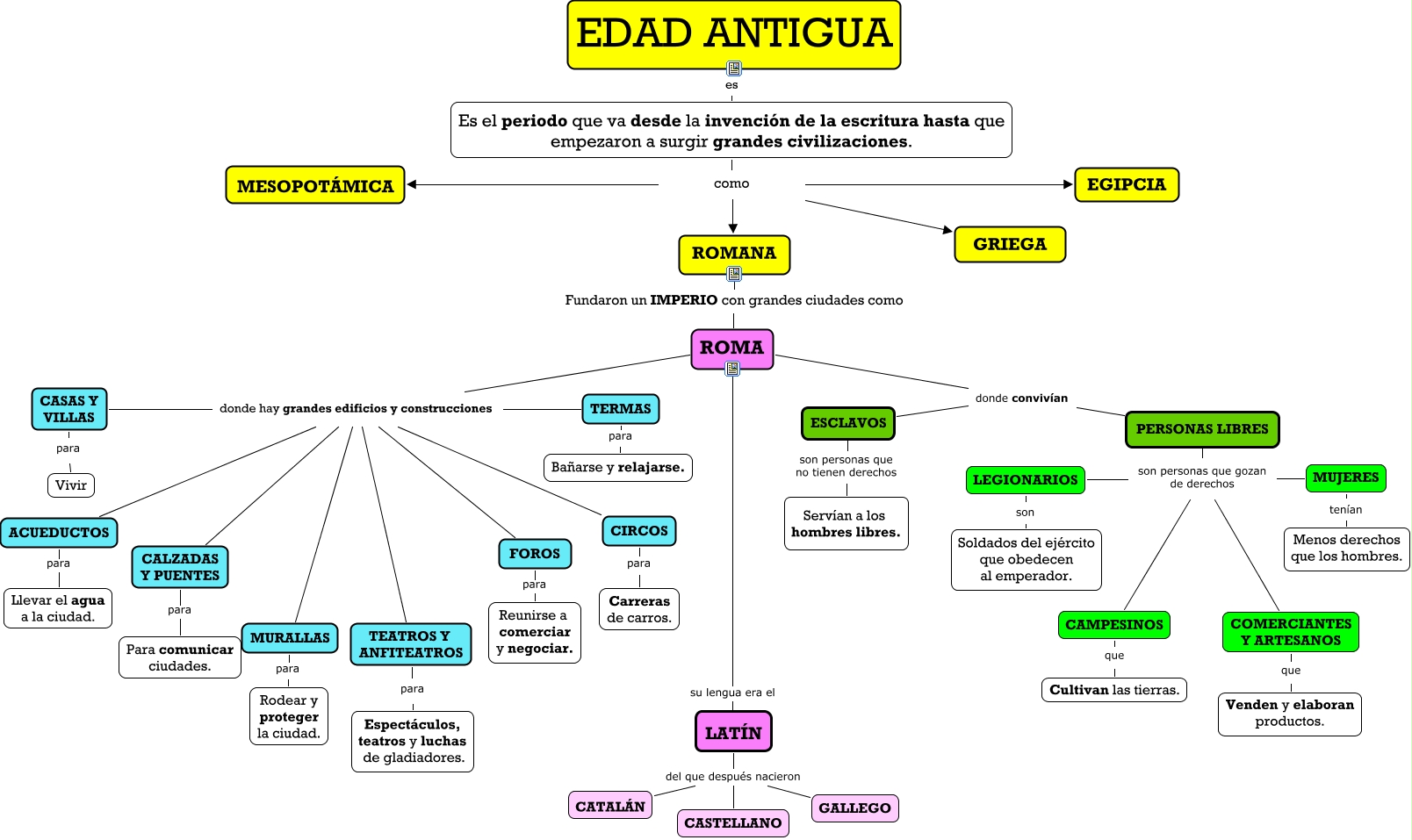 Este Cmap, tiene información relacionada con: LA EDAD ANTIGUA, ACUEDUCTOS para Llevar el agua a la ciudad., ROMA donde hay grandes edificios y construcciones CASAS Y VILLAS, PERSONAS LIBRES son personas que gozan de derechos MUJERES, ROMA donde hay grandes edificios y construcciones CALZADAS Y PUENTES, CAMPESINOS que Cultivan las tierras., ROMA su lengua era el LATÍN, CALZADAS Y PUENTES para Para comunicar ciudades., ROMA donde hay grandes edificios y construcciones TERMAS, Es el periodo que va desde la invención de la escritura hasta que empezaron a surgir grandes civilizaciones. como EGIPCIA, LATÍN del que después nacieron CATALÁN, LEGIONARIOS son Soldados del ejército que obedecen al emperador., MURALLAS para Rodear y proteger la ciudad., ROMA donde hay grandes edificios y construcciones MURALLAS, Es el periodo que va desde la invención de la escritura hasta que empezaron a surgir grandes civilizaciones. como ROMANA, ROMA donde hay grandes edificios y construcciones FOROS, PERSONAS LIBRES son personas que gozan de derechos LEGIONARIOS, LATÍN del que después nacieron CASTELLANO, COMERCIANTES Y ARTESANOS que Venden y elaboran productos., ROMA donde hay grandes edificios y construcciones TEATROS Y ANFITEATROS, ROMA donde convivían ESCLAVOS