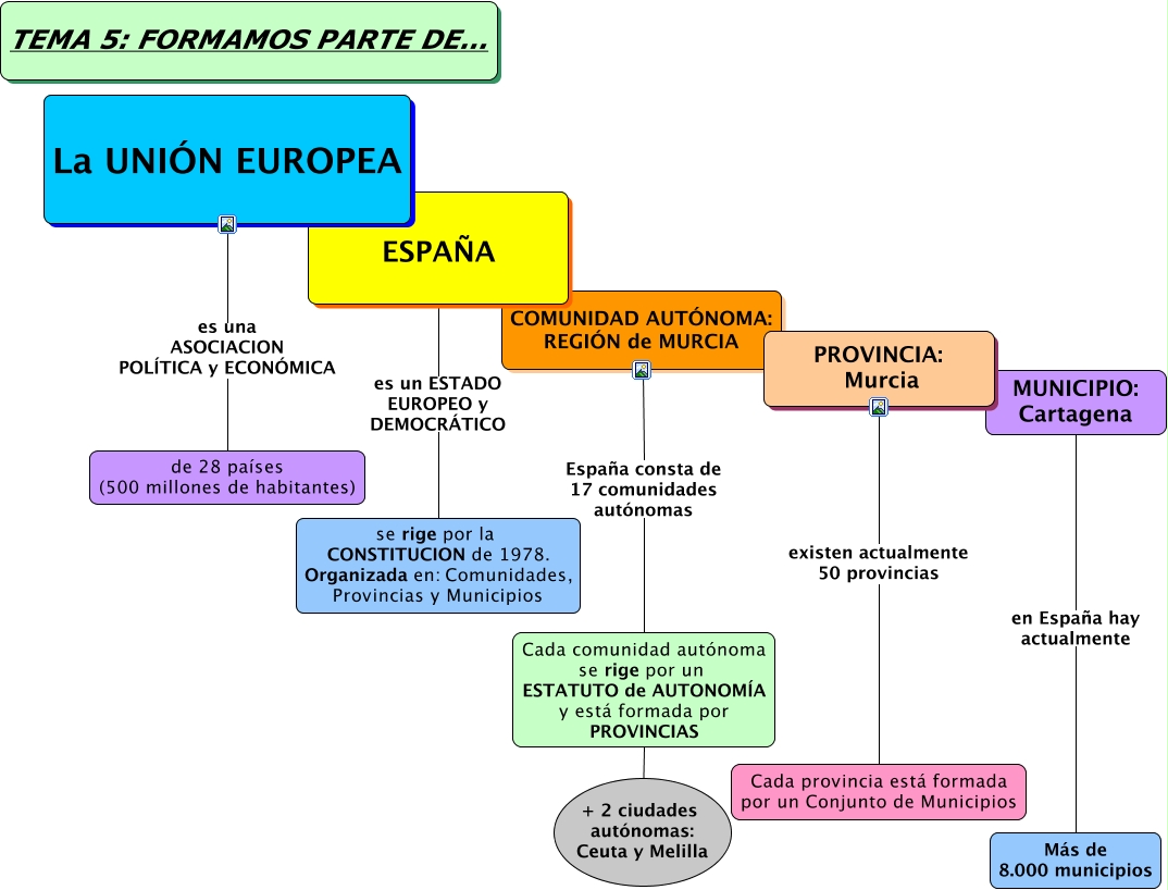 Este Cmap, tiene información relacionada con: 13.1 - FORMAMOS PARTE DE, PROVINCIA: Murcia existen actualmente 50 provincias Cada provincia está formada por un Conjunto de Municipios, MUNICIPIO: Cartagena en España hay actualmente Más de 8.000 municipios, Cada comunidad autónoma se rige por un ESTATUTO de AUTONOMÍA y está formada por PROVINCIAS ???? + 2 ciudades autónomas: Ceuta y Melilla, COMUNIDAD AUTÓNOMA: REGIÓN de MURCIA España consta de 17 comunidades autónomas Cada comunidad autónoma se rige por un ESTATUTO de AUTONOMÍA y está formada por PROVINCIAS, ESPAÑA es un ESTADO EUROPEO y DEMOCRÁTICO se rige por la CONSTITUCION de 1978. Organizada en: Comunidades, Provincias y Municipios, La UNIÓN EUROPEA es una ASOCIACION POLÍTICA y ECONÓMICA de 28 países (500 millones de habitantes)