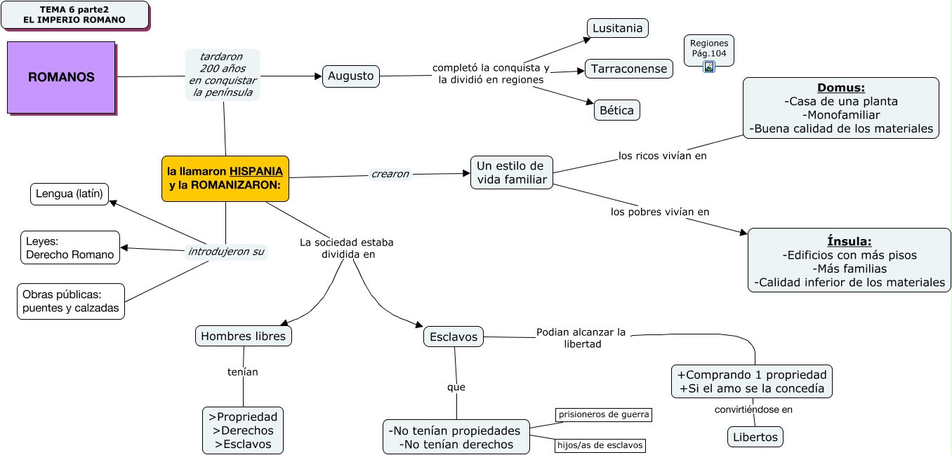 Este Cmap, tiene información relacionada con: Imperio Romano, -No tenían propiedades -No tenían derechos ???? prisioneros de guerra, Augusto completó la conquista y la dividió en regiones Bética, Augusto completó la conquista y la dividió en regiones Tarraconense, Domus: -Casa de una planta -Monofamiliar -Buena calidad de los materiales los ricos vivían en Un estilo de vida familiar, Hombres libres tenían >Propriedad >Derechos >Esclavos, la llamaron HISPANIA y la ROMANIZARON: introdujeron su Obras públicas: puentes y calzadas, ROMANOS tardaron 200 años en conquistar la península Augusto, Augusto completó la conquista y la dividió en regiones Lusitania, la llamaron HISPANIA y la ROMANIZARON: introdujeron su Lengua (latín), Esclavos que -No tenían propiedades -No tenían derechos, la llamaron HISPANIA y la ROMANIZARON: introdujeron su Leyes: Derecho Romano, la llamaron HISPANIA y la ROMANIZARON: La sociedad estaba dividida en Esclavos, +Comprando 1 propriedad +Si el amo se la concedía convirtiéndose en Libertos, -No tenían propiedades -No tenían derechos ???? hijos/as de esclavos, ROMANOS tardaron 200 años en conquistar la península la llamaron HISPANIA y la ROMANIZARON:, Esclavos Podian alcanzar la libertad +Comprando 1 propriedad +Si el amo se la concedía, la llamaron HISPANIA y la ROMANIZARON: crearon Un estilo de vida familiar, la llamaron HISPANIA y la ROMANIZARON: La sociedad estaba dividida en Hombres libres, Un estilo de vida familiar los pobres vivían en Ínsula: -Edificios con más pisos -Más familias -Calidad inferior de los materiales