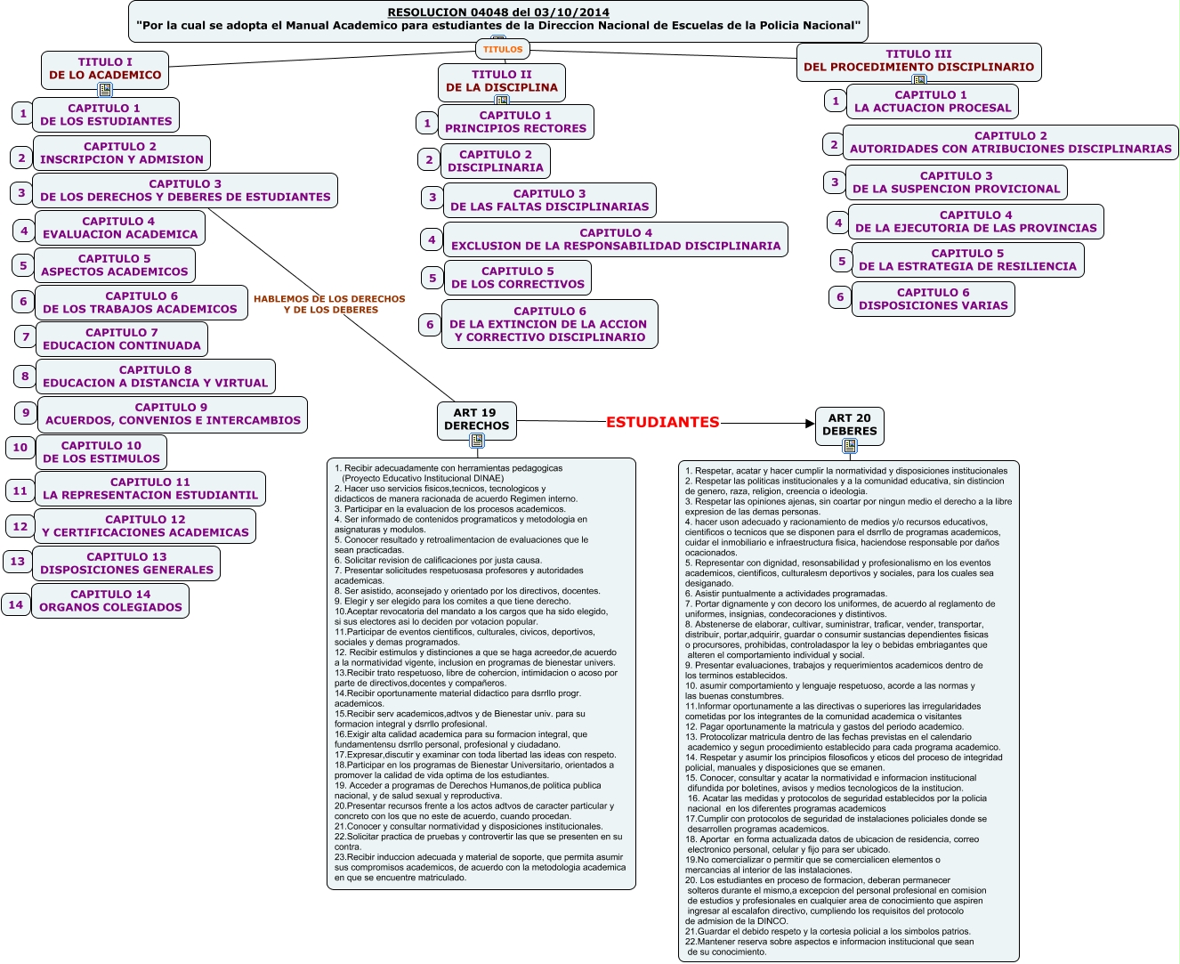 Este Cmap, tiene información relacionada con: DERECHOS Y DEBERES MAPA CONCEPTUAL RES 04048 IT. CERON, TITULOS ???? TITULO I DE LO ACADEMICO, TITULOS ???? TITULO III DEL PROCEDIMIENTO DISCIPLINARIO, ART 20 DEBERES ???? 1. Respetar, acatar y hacer cumplir la normatividad y disposiciones institucionales 2. Respetar las politicas institucionales y a la comunidad educativa, sin distincion de genero, raza, religion, creencia o ideologia. 3. Respetar las opiniones ajenas, sin coartar por ningun medio el derecho a la libre expresion de las demas personas. 4. hacer uson adecuado y racionamiento de medios y/o recursos educativos, cientificos o tecnicos que se disponen para el dsrrllo de programas academicos, cuidar el inmobiliario e infraestructura fisica, haciendose responsable por daños ocacionados. 5. Representar con dignidad, resonsabilidad y profesionalismo en los eventos academicos, cientificos, culturalesm deportivos y sociales, para los cuales sea desiganado. 6. Asistir puntualmente a actividades programadas. 7. Portar dignamente y con decoro los uniformes, de acuerdo al reglamento de uniformes, insignias, condecoraciones y distintivos. 8. Abstenerse de elaborar, cultivar, suministrar, traficar, vender, transportar, distribuir, portar,adquirir, guardar o consumir sustancias dependientes fisicas o procursores, prohibidas, controladaspor la ley o bebidas embriagantes que alteren el comportamiento individual y social. 9. Presentar evaluaciones, trabajos y requerimientos academicos dentro de los terminos establecidos. 10. asumir comportamiento y lenguaje respetuoso, acorde a las normas y las buenas constumbres. 11.Informar oportunamente a las directivas o superiores las irregularidades cometidas por los integrantes de la comunidad academica o visitantes 12. Pagar oportunamente la matricula y gastos del periodo academico. 13. Protocolizar matricula dentro de las fechas previstas en el calendario academico y segun procedimiento establecido para cada programa academico. 14. Respetar y asumir los principios filosoficos y eticos del proceso de integridad policial, manuales y disposiciones que se emanen. 15. Conocer, consultar y acatar la normatividad e informacion institucional difundida por boletines, avisos y medios tecnologicos de la institucion. 16. Acatar las medidas y protocolos de seguridad establecidos por la policia nacional en los diferentes programas academicos 17.Cumplir con protocolos de seguridad de instalaciones policiales donde se desarrollen programas academicos. 18. Aportar en forma actualizada datos de ubicacion de residencia, correo electronico personal, celular y fijo para ser ubicado. 19.No comercializar o permitir que se comercialicen elementos o mercancias al interior de las instalaciones. 20. Los estudiantes en proceso de formacion, deberan permanecer solteros durante el mismo,a excepcion del personal profesional en comision de estudios y profesionales en cualquier area de conocimiento que aspiren ingresar al escalafon directivo, cumpliendo los requisitos del protocolo de admision de la DINCO. 21.Guardar el debido respeto y la cortesia policial a los simbolos patrios. 22.Mantener reserva sobre aspectos e informacion institucional que sean de su conocimiento., CAPITULO 3 DE LOS DERECHOS Y DEBERES DE ESTUDIANTES HABLEMOS DE LOS DERECHOS Y DE LOS DEBERES ART 19 DERECHOS, TITULOS ???? TITULO II DE LA DISCIPLINA, ART 19 DERECHOS ???? 1. Recibir adecuadamente con herramientas pedagogicas (Proyecto Educativo Institucional DINAE) 2. Hacer uso servicios fisicos,tecnicos, tecnologicos y didacticos de manera racionada de acuerdo Regimen interno. 3. Participar en la evaluacion de los procesos academicos. 4. Ser informado de contenidos programaticos y metodologia en asignaturas y modulos. 5. Conocer resultado y retroalimentacion de evaluaciones que le sean practicadas. 6. Solicitar revision de calificaciones por justa causa. 7. Presentar solicitudes respetuosasa profesores y autoridades academicas. 8. Ser asistido, aconsejado y orientado por los directivos, docentes. 9. Elegir y ser elegido para los comites a que tiene derecho. 10.Aceptar revocatoria del mandato a los cargos que ha sido elegido, si sus electores asi lo deciden por votacion popular. 11.Participar de eventos cientificos, culturales, civicos, deportivos, sociales y demas programados. 12. Recibir estimulos y distinciones a que se haga acreedor,de acuerdo a la normatividad vigente, inclusion en programas de bienestar univers. 13.Recibir trato respetuoso, libre de cohercion, intimidacion o acoso por parte de directivos,docentes y compañeros. 14.Recibir oportunamente material didactico para dsrrllo progr. academicos. 15.Recibir serv academicos,adtvos y de Bienestar univ. para su formacion integral y dsrrllo profesional. 16.Exigir alta calidad academica para su formacion integral, que fundamentensu dsrrllo personal, profesional y ciudadano. 17.Expresar,discutir y examinar con toda libertad las ideas con respeto. 18.Participar en los programas de Bienestar Universitario, orientados a promover la calidad de vida optima de los estudiantes. 19. Acceder a programas de Derechos Humanos,de politica publica nacional, y de salud sexual y reproductiva. 20.Presentar recursos frente a los actos adtvos de caracter particular y concreto con los que no este de acuerdo, cuando procedan. 21.Conocer y consultar normatividad y disposiciones institucionales. 22.Solicitar practica de pruebas y controvertir las que se presenten en su contra. 23.Recibir induccion adecuada y material de soporte, que permita asumir sus compromisos academicos, de acuerdo con la metodologia academica en que se encuentre matriculado., ART 19 DERECHOS ESTUDIANTES ART 20 DEBERES