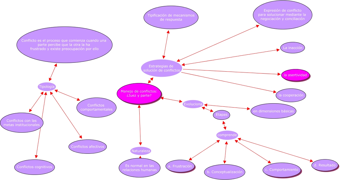 Este Cmap, tiene información relacionada con: capitulo 16, La inacción Estrategias de solución de conflictos la cooperación, Etapas comprende b. Conceptualización, Expresión de conflicto para solucionar mediante la negociación y conciliación Estrategias de solución de conflictos la cooperación, Tipificación de mecanismos de respuesta Estrategias de solución de conflictos la asertividad, Es normal en las relaciones humanas Naturaleza Manejo de conflictos: ¿Juez y parte?, Tipificación de mecanismos de respuesta Estrategias de solución de conflictos Manejo de conflictos: ¿Juez y parte?, La inacción Estrategias de solución de conflictos la asertividad, Etapas comprende a. Frustración, La inacción Estrategias de solución de conflictos Manejo de conflictos: ¿Juez y parte?, Expresión de conflicto para solucionar mediante la negociación y conciliación Estrategias de solución de conflictos la asertividad, Tipificación de mecanismos de respuesta Estrategias de solución de conflictos la cooperación, en dimensiones básicas Evoluciona Manejo de conflictos: ¿Juez y parte?, Conflictos cognitivos Tipología Conflicto es el proceso que comienza cuando una parte percibe que la otra la ha frustrado y existe preocupación por ello, Conflictos comportamentales Tipología Conflicto es el proceso que comienza cuando una parte percibe que la otra la ha frustrado y existe preocupación por ello, Etapas comprende c. Comportamiento, Expresión de conflicto para solucionar mediante la negociación y conciliación Estrategias de solución de conflictos Manejo de conflictos: ¿Juez y parte?, Etapas comprende d. Resultado, Conflictos con las metas institucionales Tipología Conflicto es el proceso que comienza cuando una parte percibe que la otra la ha frustrado y existe preocupación por ello, Etapas Evoluciona Manejo de conflictos: ¿Juez y parte?, Conflictos afectivos Tipología Conflicto es el proceso que comienza cuando una parte percibe que la otra la ha frustrado y existe preocupación por ello
