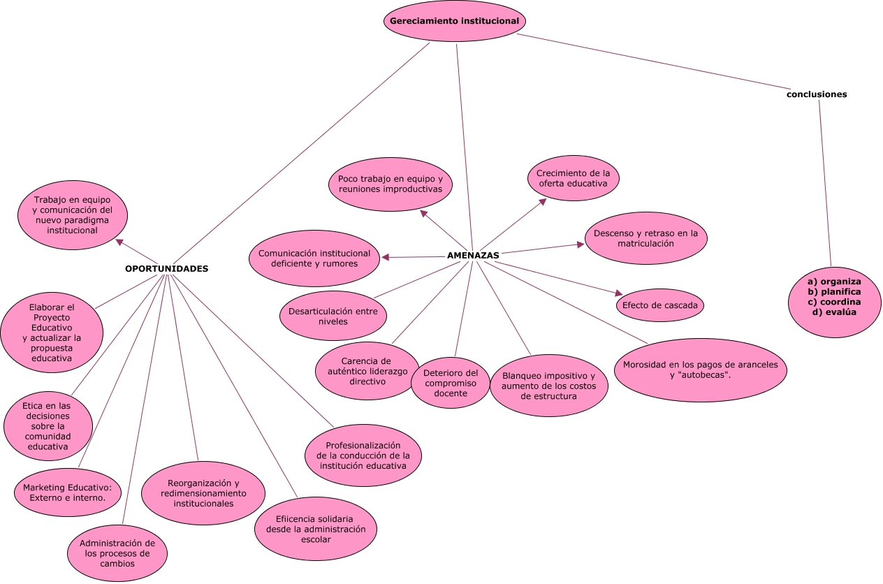 Este Cmap, tiene información relacionada con: capítulo 1, Gereciamiento institucional OPORTUNIDADES Reorganización y redimensionamiento institucionales, Gereciamiento institucional AMENAZAS Desarticulación entre niveles, Gereciamiento institucional AMENAZAS Deterioro del compromiso docente, Gereciamiento institucional AMENAZAS Poco trabajo en equipo y reuniones improductivas, Gereciamiento institucional AMENAZAS Comunicación institucional deficiente y rumores, Gereciamiento institucional AMENAZAS Efecto de cascada, Gereciamiento institucional OPORTUNIDADES Trabajo en equipo y comunicación del nuevo paradigma institucional, Gereciamiento institucional AMENAZAS Blanqueo impositivo y aumento de los costos de estructura, Gereciamiento institucional AMENAZAS Crecimiento de la oferta educativa, Gereciamiento institucional AMENAZAS Descenso y retraso en la matriculación, Gereciamiento institucional conclusiones a) organiza b) planifica c) coordina d) evalúa, Gereciamiento institucional AMENAZAS Morosidad en los pagos de aranceles y "autobecas"., Gereciamiento institucional OPORTUNIDADES Etica en las decisiones sobre la comunidad educativa, Gereciamiento institucional OPORTUNIDADES Efiicencia solidaria desde la administración escolar, Gereciamiento institucional OPORTUNIDADES Profesionalización de la conducción de la institución educativa, Gereciamiento institucional AMENAZAS Carencia de auténtico liderazgo directivo, Gereciamiento institucional OPORTUNIDADES Administración de los procesos de cambios, Gereciamiento institucional OPORTUNIDADES Elaborar el Proyecto Educativo y actualizar la propuesta educativa, Gereciamiento institucional OPORTUNIDADES Marketing Educativo: Externo e interno.