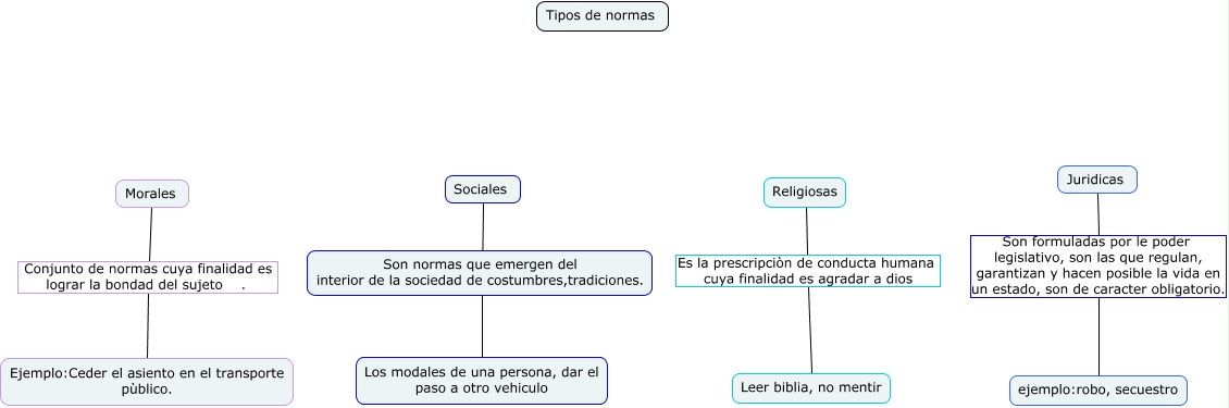 Este Cmap, tiene información relacionada con: Normas juridicas, Morales Conjunto de normas cuya finalidad es lograr la bondad del sujeto . Ejemplo:Ceder el asiento en el transporte pùblico., Sociales ???? Los modales de una persona, dar el paso a otro vehiculo, Religiosas Es la prescripciòn de conducta humana cuya finalidad es agradar a dios Leer biblia, no mentir, Juridicas Son formuladas por le poder legislativo, son las que regulan, garantizan y hacen posible la vida en un estado, son de caracter obligatorio. ejemplo:robo, secuestro