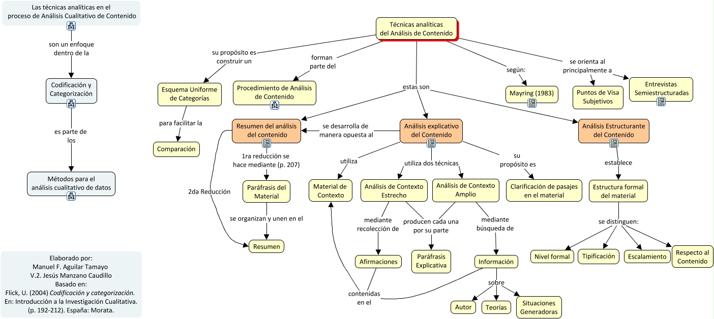 Este Cmap, tiene información relacionada con: Técnicas analíticas del Análisis de Contenido, Técnicas analíticas del Análisis de Contenido según: Mayring (1983), Análisis explicativo del Contenido su propósito es Clarificación de pasajes en el material, Análisis explicativo del Contenido utiliza dos técnicas Análisis de Contexto Amplio, Análisis de Contexto Estrecho mediante recolección de Afirmaciones, Codificación y Categorización es parte de los Métodos para el análisis cualitativo de datos, Información sobre Autor, Esquema Uniforme de Categorías para facilitar la Comparación, Técnicas analíticas del Análisis de Contenido estas son Análisis explicativo del Contenido, Resumen del análisis del contenido 1ra reducción se hace mediante (p. 207) Paráfrasis del Material, Estructura formal del material se distinguen: Tipificación, Análisis explicativo del Contenido utiliza Material de Contexto, Análisis de Contexto Amplio producen cada una por su parte Paráfrasis Explicativa, Técnicas analíticas del Análisis de Contenido su propósito es construir un Esquema Uniforme de Categorías, Información sobre Situaciones Generadoras, Afirmaciones contenidas en el Material de Contexto, Análisis Estructurante del Contenido establece Estructura formal del material, Análisis de Contexto Estrecho producen cada una por su parte Paráfrasis Explicativa, Paráfrasis del Material se organizan y unen en el Resumen, Información sobre Teorías, Análisis de Contexto Amplio mediante búsqueda de Información