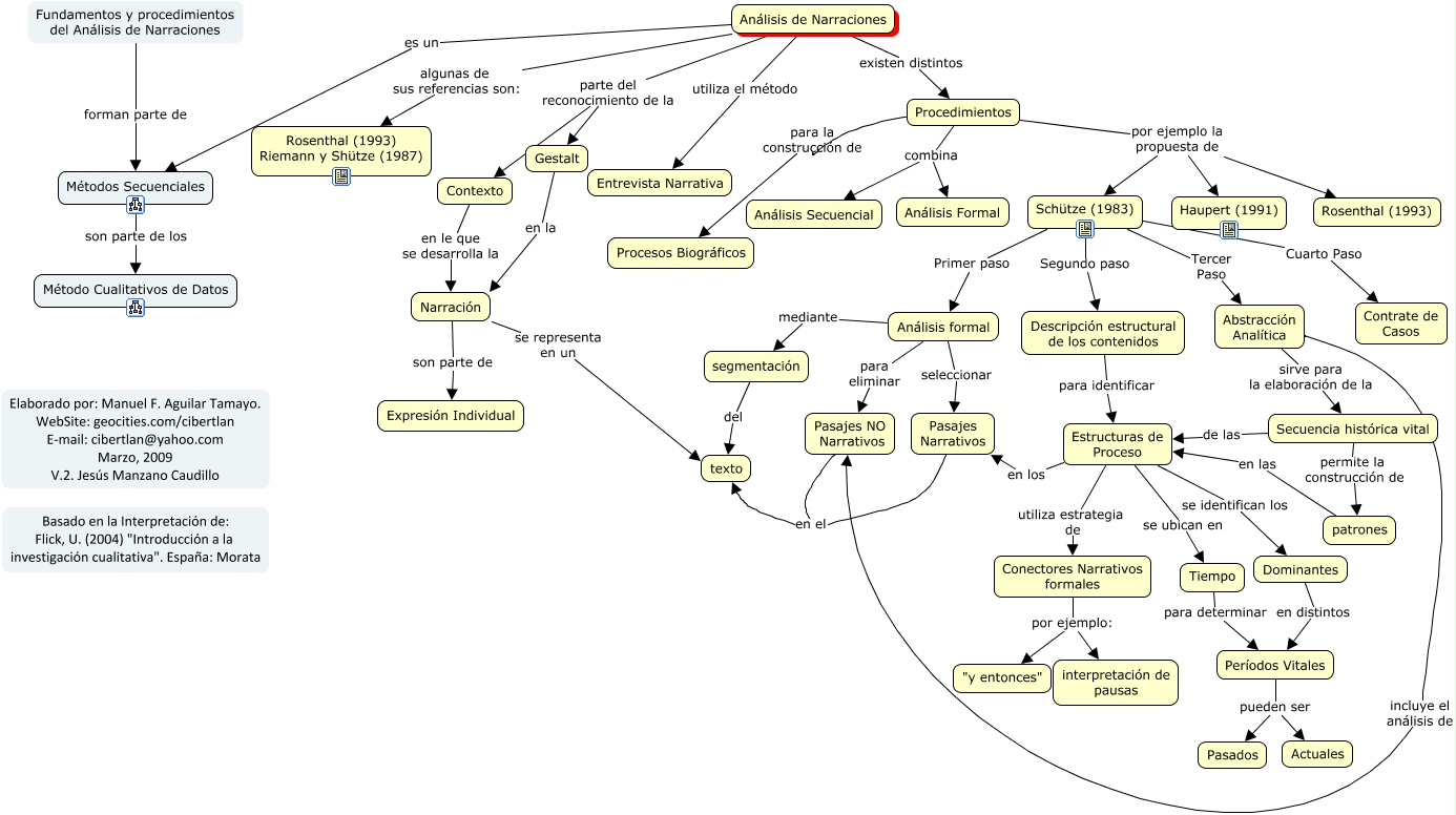 Este Cmap, tiene información relacionada con: Análisis de Narraciones, Fundamentos y procedimientos del Análisis de Narraciones forman parte de Métodos Secuenciales, Análisis de Narraciones parte del reconocimiento de la Gestalt, Análisis formal mediante segmentación, segmentación del texto, Estructuras de Proceso utiliza estrategia de Conectores Narrativos formales, Conectores Narrativos formales por ejemplo: interpretación de pausas, patrones en las Estructuras de Proceso, Procedimientos por ejemplo la propuesta de Haupert (1991), Narración se representa en un texto, Procedimientos para la construcción de Procesos Biográficos, Análisis formal seleccionar Pasajes Narrativos, Procedimientos por ejemplo la propuesta de Rosenthal (1993), Análisis de Narraciones es un Métodos Secuenciales, Contexto en le que se desarrolla la Narración, Estructuras de Proceso en los Pasajes Narrativos, Conectores Narrativos formales por ejemplo: "y entonces", Secuencia histórica vital permite la construcción de patrones, Métodos Secuenciales son parte de los Método Cualitativos de Datos, Procedimientos combina Análisis Formal, Análisis de Narraciones algunas de sus referencias son: Rosenthal (1993) Riemann y Shütze (1987)