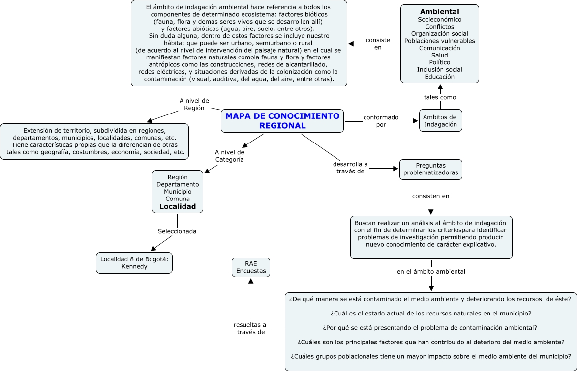 This Concept Map, created with IHMC CmapTools, has information related to: Mapa de conocimiento regional Kennedy, ¿De qué manera se está contaminado el medio ambiente y deteriorando los recursos de éste? ¿Cuál es el estado actual de los recursos naturales en el municipio? ¿Por qué se está presentando el problema de contaminación ambiental? ¿Cuáles son los principales factores que han contribuido al deterioro del medio ambiente? ¿Cuáles grupos poblacionales tiene un mayor impacto sobre el medio ambiente del municipio? resueltas a través de RAE Encuestas, MAPA DE CONOCIMIENTO REGIONAL conformado por Ámbitos de Indagación, MAPA DE CONOCIMIENTO REGIONAL A nivel de Categoría Región Departamento Municipio Comuna Localidad, MAPA DE CONOCIMIENTO REGIONAL desarrolla a través de Preguntas problematizadoras, Buscan realizar un análisis al ámbito de indagación con el fin de determinar los criteriospara identificar problemas de investigación permitiendo producir nuevo conocimiento de carácter explicativo. en el ámbito ambiental ¿De qué manera se está contaminado el medio ambiente y deteriorando los recursos de éste? ¿Cuál es el estado actual de los recursos naturales en el municipio? ¿Por qué se está presentando el problema de contaminación ambiental? ¿Cuáles son los principales factores que han contribuido al deterioro del medio ambiente? ¿Cuáles grupos poblacionales tiene un mayor impacto sobre el medio ambiente del municipio?, Ambiental Socieconómico Conflictos Organización social Poblaciones vulnerables Comunicación Salud Político Inclusión social Educación consiste en El ámbito de indagación ambiental hace referencia a todos los componentes de determinado ecosistema: factores bióticos (fauna, flora y demás seres vivos que se desarrollen allí) y factores abióticos (agua, aire, suelo, entre otros). Sin duda alguna, dentro de estos factores se incluye nuestro hábitat que puede ser urbano, semiurbano o rural (de acuerdo al nivel de intervención del paisaje natural) en el cual se manifiestan factores naturales comola fauna y flora y factores antrópicos como las construcciones, redes de alcantarillado, redes eléctricas, y situaciones derivadas de la colonización como la contaminación (visual, auditiva, del agua, del aire, entre otras)., Preguntas problematizadoras consisten en Buscan realizar un análisis al ámbito de indagación con el fin de determinar los criteriospara identificar problemas de investigación permitiendo producir nuevo conocimiento de carácter explicativo., Región Departamento Municipio Comuna Localidad Seleccionada Localidad 8 de Bogotá: Kennedy, Ámbitos de Indagación tales como Ambiental Socieconómico Conflictos Organización social Poblaciones vulnerables Comunicación Salud Político Inclusión social Educación, MAPA DE CONOCIMIENTO REGIONAL A nivel de Región Extensión de territorio, subdividida en regiones, departamentos, municipios, localidades, comunas, etc. Tiene características propias que la diferencian de otras tales como geografía, costumbres, economía, sociedad, etc.