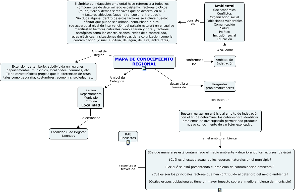 This Concept Map, created with IHMC CmapTools, has information related to: Mapa de conocimiento regional, MAPA DE CONOCIMIENTO REGIONAL conformado por Ámbitos de Indagación, ¿De qué manera se está contaminado el medio ambiente y deteriorando los recursos de éste? ¿Cuál es el estado actual de los recursos naturales en el municipio? ¿Por qué se está presentando el problema de contaminación ambiental? ¿Cuáles son los principales factores que han contribuido al deterioro del medio ambiente? ¿Cuáles grupos poblacionales tiene un mayor impacto sobre el medio ambiente del municipio? resueltas a través de RAE Encuestas, MAPA DE CONOCIMIENTO REGIONAL A nivel de Categoría Región Departamento Municipio Comuna Localidad, Buscan realizar un análisis al ámbito de indagación con el fin de determinar los criteriospara identificar problemas de investigación permitiendo producir nuevo conocimiento de carácter explicativo. en el ámbito ambiental ¿De qué manera se está contaminado el medio ambiente y deteriorando los recursos de éste? ¿Cuál es el estado actual de los recursos naturales en el municipio? ¿Por qué se está presentando el problema de contaminación ambiental? ¿Cuáles son los principales factores que han contribuido al deterioro del medio ambiente? ¿Cuáles grupos poblacionales tiene un mayor impacto sobre el medio ambiente del municipio?, MAPA DE CONOCIMIENTO REGIONAL desarrolla a través de Preguntas problematizadoras, Ambiental Socieconómico Conflictos Organización social Poblaciones vulnerables Comunicación Salud Político Inclusión social Educación consiste en El ámbito de indagación ambiental hace referencia a todos los componentes de determinado ecosistema: factores bióticos (fauna, flora y demás seres vivos que se desarrollen allí) y factores abióticos (agua, aire, suelo, entre otros). Sin duda alguna, dentro de estos factores se incluye nuestro hábitat que puede ser urbano, semiurbano o rural (de acuerdo al nivel de intervención del paisaje natural) en el cual se manifiestan factores naturales comola fauna y flora y factores antrópicos como las construcciones, redes de alcantarillado, redes eléctricas, y situaciones derivadas de la colonización como la contaminación (visual, auditiva, del agua, del aire, entre otras)., Preguntas problematizadoras consisten en Buscan realizar un análisis al ámbito de indagación con el fin de determinar los criteriospara identificar problemas de investigación permitiendo producir nuevo conocimiento de carácter explicativo., MAPA DE CONOCIMIENTO REGIONAL A nivel de Región Extensión de territorio, subdividida en regiones, departamentos, municipios, localidades, comunas, etc. Tiene características propias que la diferencian de otras tales como geografía, costumbres, economía, sociedad, etc., Ámbitos de Indagación tales como Ambiental Socieconómico Conflictos Organización social Poblaciones vulnerables Comunicación Salud Político Inclusión social Educación, Región Departamento Municipio Comuna Localidad Seleccionada Localidad 8 de Bogotá: Kennedy