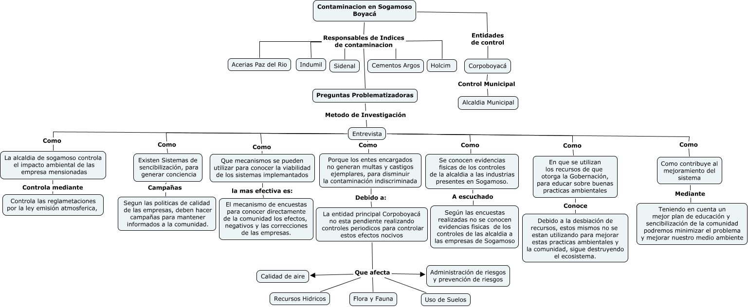 Este Cmap, tiene información relacionada con: Mapas de reconocimiento regional, Porque los entes encargados no generan multas y castigos ejemplares, para disminuir la contaminación indiscriminada Debido a: La entidad principal Corpoboyacá no esta pendiente realizando controles periodicos para controlar estos efectos nocivos, Que mecanismos se pueden utilizar para conocer la viabilidad de los sistemas implemantados la mas efectiva es: El mecanismo de encuestas para conocer directamente de la comunidad los efectos, negativos y las correcciones de las empresas., Existen Sistemas de sencibilización, para generar conciencia Campañas Segun las politicas de calidad de las empresas, deben hacer campañas para mantener informados a la comunidad., La entidad principal Corpoboyacá no esta pendiente realizando controles periodicos para controlar estos efectos nocivos Que afecta Calidad de aire, En que se utilizan los recursos de que otorga la Gobernación, para educar sobre buenas practicas ambientales Conoce Debido a la desbiación de recursos, estos mismos no se estan utilizando para mejorar estas practicas ambientales y la comunidad, sigue destruyendo el ecosistema., La entidad principal Corpoboyacá no esta pendiente realizando controles periodicos para controlar estos efectos nocivos Que afecta Flora y Fauna, Entrevista Como Se conocen evidencias fisicas de los controles de la alcaldia a las industrias presentes en Sogamoso., Corpoboyacá Control Municipal Alcaldia Municipal, Entrevista Como Porque los entes encargados no generan multas y castigos ejemplares, para disminuir la contaminación indiscriminada, Preguntas Problematizadoras Metodo de Investigación Entrevista, Contaminacion en Sogamoso Boyacá Entidades de control Corpoboyacá, Se conocen evidencias fisicas de los controles de la alcaldia a las industrias presentes en Sogamoso. A escuchado Según las encuestas realizadas no se conocen evidencias fisicas de los controles de las alcaldia a las empresas de Sogamoso, Entrevista Como La alcaldia de sogamoso controla el impacto ambiental de las empresa mensionadas, La entidad principal Corpoboyacá no esta pendiente realizando controles periodicos para controlar estos efectos nocivos Que afecta Administración de riesgos y prevención de riesgos, Entrevista Como Como contribuye al mejoramiento del sistema, Contaminacion en Sogamoso Boyacá Responsables de Indices de contaminacion Cementos Argos, La alcaldia de sogamoso controla el impacto ambiental de las empresa mensionadas Controla mediante Controla las reglametaciones por la ley emisión atmosferica,, Contaminacion en Sogamoso Boyacá Responsables de Indices de contaminacion Acerias Paz del Rio, Contaminacion en Sogamoso Boyacá Responsables de Indices de contaminacion Preguntas Problematizadoras, La entidad principal Corpoboyacá no esta pendiente realizando controles periodicos para controlar estos efectos nocivos Que afecta Uso de Suelos