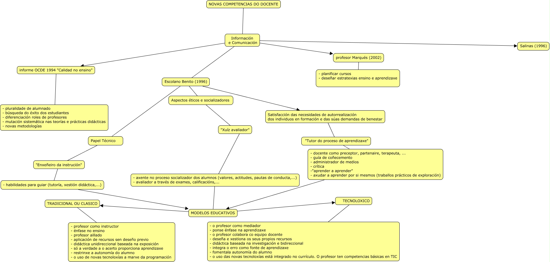 Este Cmap, tiene información relacionada con: javier, carmen, manuela, Información e Comunicación informe OCDE 1994 "Calidad no ensino", - axente no proceso socializador dos alumnos (valores, actitudes, pautas de conducta,...) - avaliador a través de exames, calificacións,... MODELOS EDUCATIVOS, Información e Comunicación Escolano Benito (1996), MODELOS EDUCATIVOS TECNOLOXICO, "Xuíz avaliador" ???? - axente no proceso socializador dos alumnos (valores, actitudes, pautas de conducta,...) - avaliador a través de exames, calificacións,..., Escolano Benito (1996) Papel Técnico, informe OCDE 1994 "Calidad no ensino" - pluralidade de alumnado - búsqueda do éxito dos estudiantes - diferenciación roles de profesores - mutación sistemática nas teorías e prácticas didácticas - novas metodologías, NOVAS COMPETENCIAS DO DOCENTE Información e Comunicación, - docente como preceptor, partenaire, terapeuta, ... - guía de coñecemento - administrador de medios - crítica -"aprender a aprender" - axudar a aprender por si mesmos (traballos prácticos de exploración) MODELOS EDUCATIVOS, Aspectos éticos e socializadores "Xuíz avaliador", TECNOLOXICO - o profesor como mediador - ponse énfase na aprendizaxe - o profesor colabora co equipo docente - deseña e xestiona os seus propios recursos - didáctica baseada na investigación e bidireccional - integra o erro como fonte de aprendizaxe - fomentala autonomía do alumno - o uso das novas tecnoloxías está integrado no currículo. O profesor ten competencias básicas en TIC, MODELOS EDUCATIVOS TRADICIONAL OU CLASICO, Satisfacción das necesidades de autorrealización dos individuos en formación e das súas demandas de benestar "Tutor do proceso de aprendizaxe", Escolano Benito (1996) Aspectos éticos e socializadores, - habilidades para guiar (tutoría, xestión didáctica,...) MODELOS EDUCATIVOS, "Enxeñeiro da instrución" - habilidades para guiar (tutoría, xestión didáctica,...), Escolano Benito (1996) Satisfacción das necesidades de autorrealización dos individuos en formación e das súas demandas de benestar, profesor Marqués (2002) - planificar cursos - deseñar estratexias ensino e aprendizaxe, "Tutor do proceso de aprendizaxe" - docente como preceptor, partenaire, terapeuta, ... - guía de coñecemento - administrador de medios - crítica -"aprender a aprender" - axudar a aprender por si mesmos (traballos prácticos de exploración), TRADICIONAL OU CLASICO - profesor como instructor - énfase no ensino - profesor aillado - aplicación de recursos sen deseño previo - didáctica unidireccional baseada na exposición - só a verdade a o acerto proporciona aprendizaxe - restrinxe a autonomía do alumno - o uso de novas tecnoloxías a marxe da programación