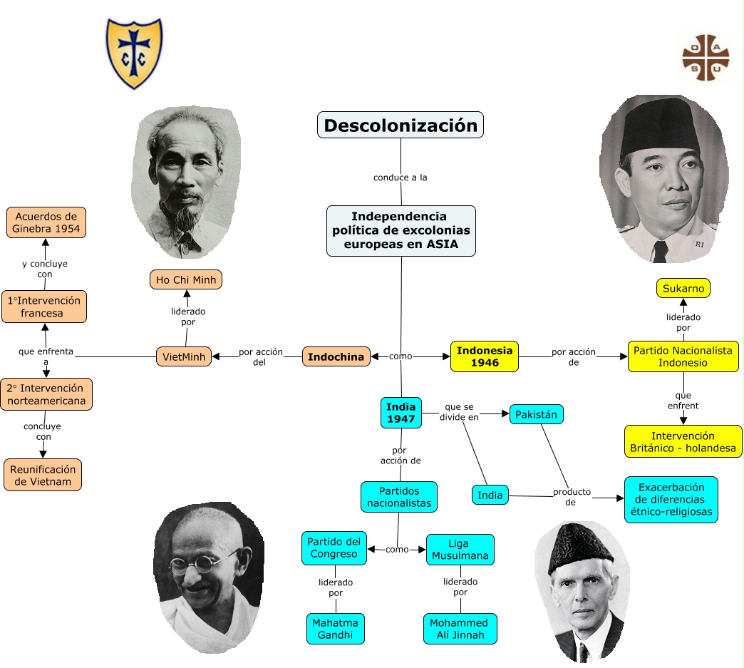 Este Cmap, tiene información relacionada con: DESCOLONIZACIÓN DE ASIA, India 1947 que se divide en India, India producto de Exacerbación de diferencias étnico-religiosas, Indonesia 1946 por acción de Partido Nacionalista Indonesio, Liga Musulmana liderado por Mohammed Alí Jinnah, 1°Intervención francesa y concluye con Acuerdos de Ginebra 1954, Independencia política de excolonias europeas en ASIA como Indochina, India 1947 por acción de Partidos nacionalistas, Partidos nacionalistas como Liga Musulmana, Pakistán producto de Exacerbación de diferencias étnico-religiosas, Descolonización conduce a la Independencia política de excolonias europeas en ASIA, VietMinh que enfrenta a 2° Intervención norteamericana, India 1947 que se divide en Pakistán, Partido del Congreso liderado por Mahatma Gandhi, VietMinh liderado por Ho Chi Minh, Indochina por acción del VietMinh, Independencia política de excolonias europeas en ASIA como Indonesia 1946, Partido Nacionalista Indonesio que enfrent Intervención Británico - holandesa, Partido Nacionalista Indonesio liderado por Sukarno, 2° Intervención norteamericana concluye con Reunificación de Vietnam, Independencia política de excolonias europeas en ASIA como India 1947