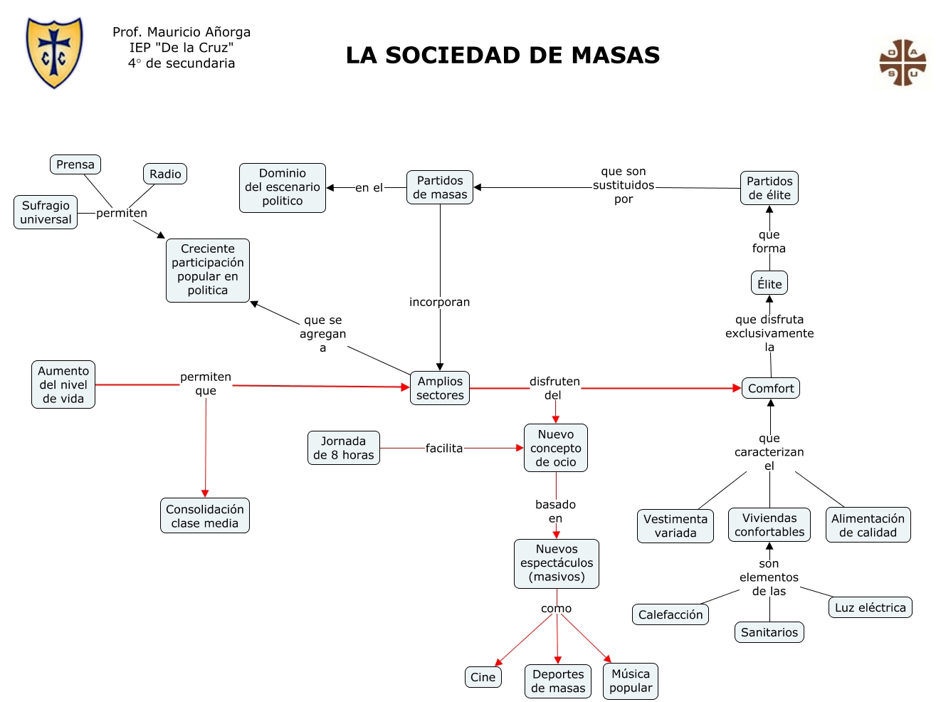 Este Cmap, tiene información relacionada con: LA SOCIEDAD DE MASAS, Nuevos espectáculos (masivos) como Música popular, Prensa permiten Creciente participación popular en politica, Comfort que disfruta exclusivamente la Élite, Nuevo concepto de ocio basado en Nuevos espectáculos (masivos), Vestimenta variada que caracterizan el Comfort, Amplios sectores que se agregan a Creciente participación popular en politica, Partidos de masas incorporan Amplios sectores, Nuevos espectáculos (masivos) como Cine, Aumento del nivel de vida permiten que Amplios sectores, Élite que forma Partidos de élite, Viviendas confortables que caracterizan el Comfort, Nuevos espectáculos (masivos) como Deportes de masas, Sanitarios son elementos de las Viviendas confortables, Partidos de élite que son sustituidos por Partidos de masas, Alimentación de calidad que caracterizan el Comfort, Radio permiten Creciente participación popular en politica, Calefacción son elementos de las Viviendas confortables, Amplios sectores disfruten del Nuevo concepto de ocio, Partidos de masas en el Dominio del escenario politico, Luz eléctrica son elementos de las Viviendas confortables