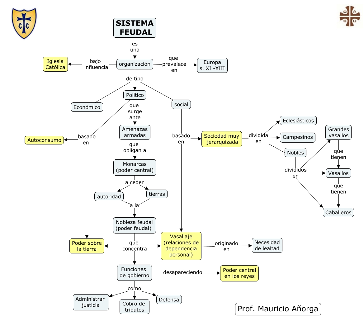 Este Cmap, tiene información relacionada con: SISTEMA FEUDAL, organización bajo influencia Iglesia Católica, Funciones de gobierno como Defensa, Nobleza feudal (poder feudal) que concentra Poder sobre la tierra, Nobles divididos en Caballeros, Político que surge ante Amenazas armadas, Grandes vasallos que tienen Vasallos, Sociedad muy jerarquizada dividida en Campesinos, Sociedad muy jerarquizada dividida en Nobles, Sociedad muy jerarquizada dividida en Eclesiásticos, Monarcas (poder central) a ceder autoridad, Económico basado en Autoconsumo, organización de tipo Económico, Vasallos que tienen Caballeros, Funciones de gobierno desapareciendo Poder central en los reyes, Funciones de gobierno como Cobro de tributos, Político basado en Poder sobre la tierra, Nobleza feudal (poder feudal) que concentra Vasallaje (relaciones de dependencia personal), Político basado en Autoconsumo, Nobles divididos en Grandes vasallos, Monarcas (poder central) a ceder tierras
