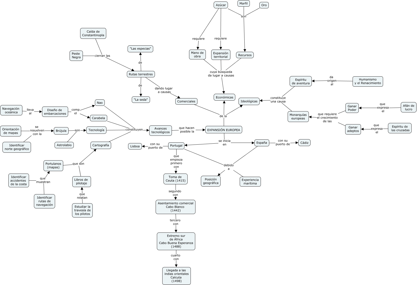 Este Cmap, tiene información relacionada con: LOS DESCUBRIMIENTOS w2, Orientación de mapas se resuelven con la Brújula, EXPANSIÓN EUROPEA se inicia en Portugal, Diseño de embarcaciones comp el Nao, España con su puerto de Cádiz, EXPANSIÓN EUROPEA de la Ideológicas, Avances tecnológicos que hacen posible la EXPANSIÓN EUROPEA, Marfil son Recursos, Brújula son Tecnología, Nao constituyen Avances tecnológicos, Extremo sur de África Cabo Buena Esperanza (1488) cuarto con Llegada a las indias orientales Calcuta (1498), Azúcar requiere Mano de obra, Portulanos (mapas) que son Cartografía, Identificar accidentes de la costa que muestran Identificar rutas de navegación, Identificar norte geográfico se resuelven con la Brújula, España debido a Posición geográfica, Diseño de embarcaciones comp el Carabela, Rutas terrestres de "Las especias", Caída de Constantinopla cierran las Rutas terrestres, Rutas terrestres de "La seda", EXPANSIÓN EUROPEA se inicia en España