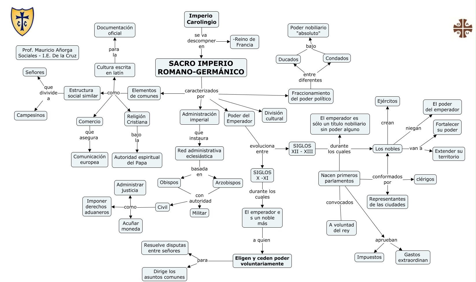 Este Cmap, tiene información relacionada con: IMPERIO ROMANO GERMÁNICO, Obispos con autoridad Civil, Cultura escrita en latín para la Documentación oficial, Elementos de comunes como Comercio, Eligen y ceden poder voluntariamente para Dirige los asuntos comunes, Nacen primeros parlamentos aprueban Gastos extraordinan, SACRO IMPERIO ROMANO-GERMÁNICO caracterizados por Administración imperial, Poder del Emperador evoluciona entre SIGLOS X -XI, Religión Cristiana bajo la Autoridad espiritual del Papa, SIGLOS XII - XIII durante los cuales Los nobles, Eligen y ceden poder voluntariamente para Resuelve disputas entre señores, Imperio Carolingio se va descompner en SACRO IMPERIO ROMANO-GERMÁNICO, Nacen primeros parlamentos aprueban Impuestos, Estructura social similar que divivide a Campesinos, Ducados bajo Poder nobiliario "absoluto", Fraccionamiento del poder político entre diferentes Ducados, El emperador e s un noble más a quien Eligen y ceden poder voluntariamente, Administración imperial que instaura Red administrativa eclesiástica, SACRO IMPERIO ROMANO-GERMÁNICO caracterizados por Poder del Emperador, Comercio que asegura Comunicación europea, Civil como Administrar justicia