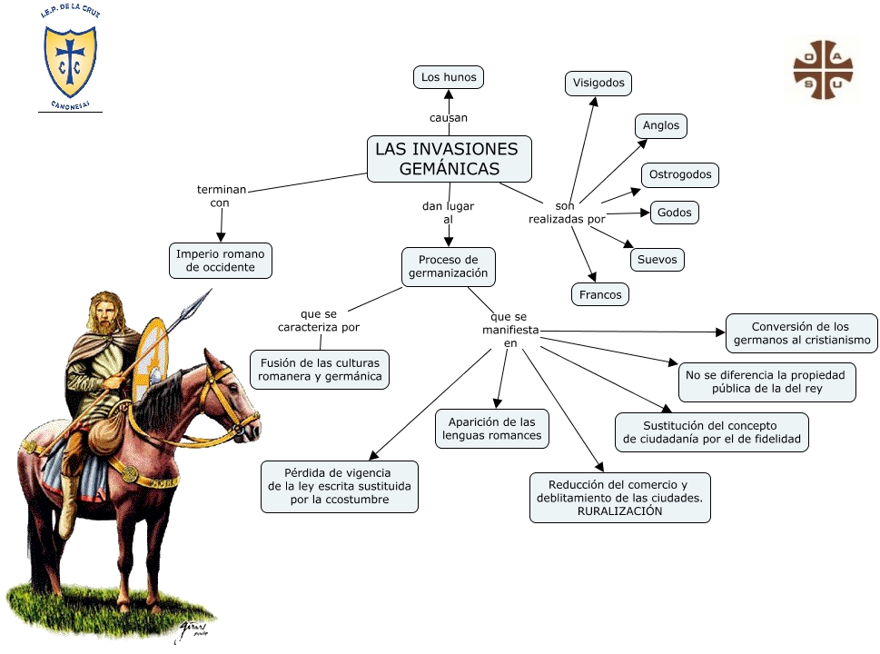 Este Cmap, tiene información relacionada con: LAS INVASIONES GERMÁNICAS, LAS INVASIONES GEMÁNICAS son realizadas por Visigodos, LAS INVASIONES GEMÁNICAS son realizadas por Ostrogodos, Proceso de germanización que se caracteriza por Fusión de las culturas romanera y germánica, LAS INVASIONES GEMÁNICAS son realizadas por Suevos, LAS INVASIONES GEMÁNICAS terminan con Imperio romano de occidente, LAS INVASIONES GEMÁNICAS son realizadas por Anglos, Proceso de germanización que se manifiesta en Conversión de los germanos al cristianismo, Proceso de germanización que se manifiesta en Sustitución del concepto de ciudadanía por el de fidelidad, Proceso de germanización que se manifiesta en Pérdida de vigencia de la ley escrita sustituida por la ccostumbre, Proceso de germanización que se manifiesta en Reducción del comercio y deblitamiento de las ciudades. RURALIZACIÓN, LAS INVASIONES GEMÁNICAS son realizadas por Godos, Proceso de germanización que se manifiesta en No se diferencia la propiedad pública de la del rey, LAS INVASIONES GEMÁNICAS causan Los hunos, Proceso de germanización que se manifiesta en Aparición de las lenguas romances, LAS INVASIONES GEMÁNICAS dan lugar al Proceso de germanización, LAS INVASIONES GEMÁNICAS son realizadas por Francos