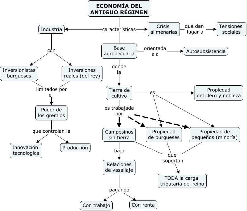 Este Cmap, tiene información relacionada con: ECONOMÍA DEL ANTIGUO RÉGIMEN, ECONOMÍA DEL ANTIGUO RÉGIMEN características Crisis alimenarias, Inversionistas burgueses limitados por el Poder de los gremios, Crisis alimenarias que dan lugar a Tensiones sociales, Relaciones de vasallaje pagando Con renta, Tierra de cultivo es trabajada por Propiedad de pequeños (minoría), Inversiones reales (del rey) limitados por el Poder de los gremios, Base agropecuaria donde la Tierra de cultivo, Tierra de cultivo es Propiedad del clero y nobleza, Tierra de cultivo es Propiedad de burgueses, Campesinos sin tierra que soportan TODA la carga tributaria del reino, Industria con Inversionistas burgueses, Propiedad de pequeños (minoría) que soportan TODA la carga tributaria del reino, Tierra de cultivo es trabajada por Propiedad de burgueses, ECONOMÍA DEL ANTIGUO RÉGIMEN características Base agropecuaria, Poder de los gremios que controlan la Innovación tecnologica, Base agropecuaria orientada ala Autosubsistencia, Industria con Inversiones reales (del rey), Relaciones de vasallaje pagando Con trabajo, Tierra de cultivo es trabajada por Campesinos sin tierra, Tierra de cultivo es Propiedad de pequeños (minoría)