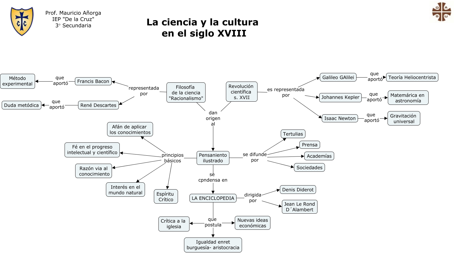 Este Cmap, tiene información relacionada con: CIENCIA Y CULTURA n el siglo XVIII, LA ENCICLOPEDIA que postula Crítica a la iglesia, Revolución científica s. XVII dan origen al Pensaniento ilustrado, Pensaniento ilustrado principios básicos Espíritu Crítico, Pensaniento ilustrado principios básicos Interés en el mundo natural, Pensaniento ilustrado se cpndensa en LA ENCICLOPEDIA, Pensaniento ilustrado se difunde por Academías, Revolución científica s. XVII es representada por Isaac Newton, Filosofía de la ciencia "Racionalismo" representada por Francis Bacon, Isaac Newton que aportó Gravitación universal, Pensaniento ilustrado principios básicos Fé en el progreso intelectual y científico, LA ENCICLOPEDIA dirigida por Denis Diderot, LA ENCICLOPEDIA que postula Nuevas ideas económicas, Filosofía de la ciencia "Racionalismo" representada por René Descartes, Revolución científica s. XVII es representada por Galileo GAlilei, Pensaniento ilustrado se difunde por Sociedades, LA ENCICLOPEDIA dirigida por Jean Le Rond D´Alambert, LA ENCICLOPEDIA que postula Igualdad enret burguesía- aristocracia, Pensaniento ilustrado principios básicos Afán de aplicar los conocimientos, Pensaniento ilustrado se difunde por Prensa, Revolución científica s. XVII es representada por Johannes Kepler
