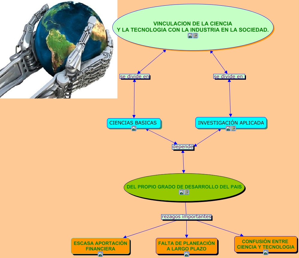Este Cmap, tiene información relacionada con: Mapa Coceptual Ciencia y Tecnologia, VINCULACION DE LA CIENCIA Y LA TECNOLOGIA CON LA INDUSTRIA EN LA SOCIEDAD. se divide en CIENCIAS BASICAS, DEL PROPIO GRADO DE DESARROLLO DEL PAIS rezagos importantes ESCASA APORTACIÓN FINANCIERA, CIENCIAS BASICAS depende DEL PROPIO GRADO DE DESARROLLO DEL PAIS, VINCULACION DE LA CIENCIA Y LA TECNOLOGIA CON LA INDUSTRIA EN LA SOCIEDAD. se divide en INVESTIGACIÓN APLICADA, INVESTIGACIÓN APLICADA depende DEL PROPIO GRADO DE DESARROLLO DEL PAIS, DEL PROPIO GRADO DE DESARROLLO DEL PAIS rezagos importantes FALTA DE PLANEACIÓN A LARGO PLAZO, DEL PROPIO GRADO DE DESARROLLO DEL PAIS rezagos importantes CONFUSIÓN ENTRE CIENCIA Y TECNOLOGIA