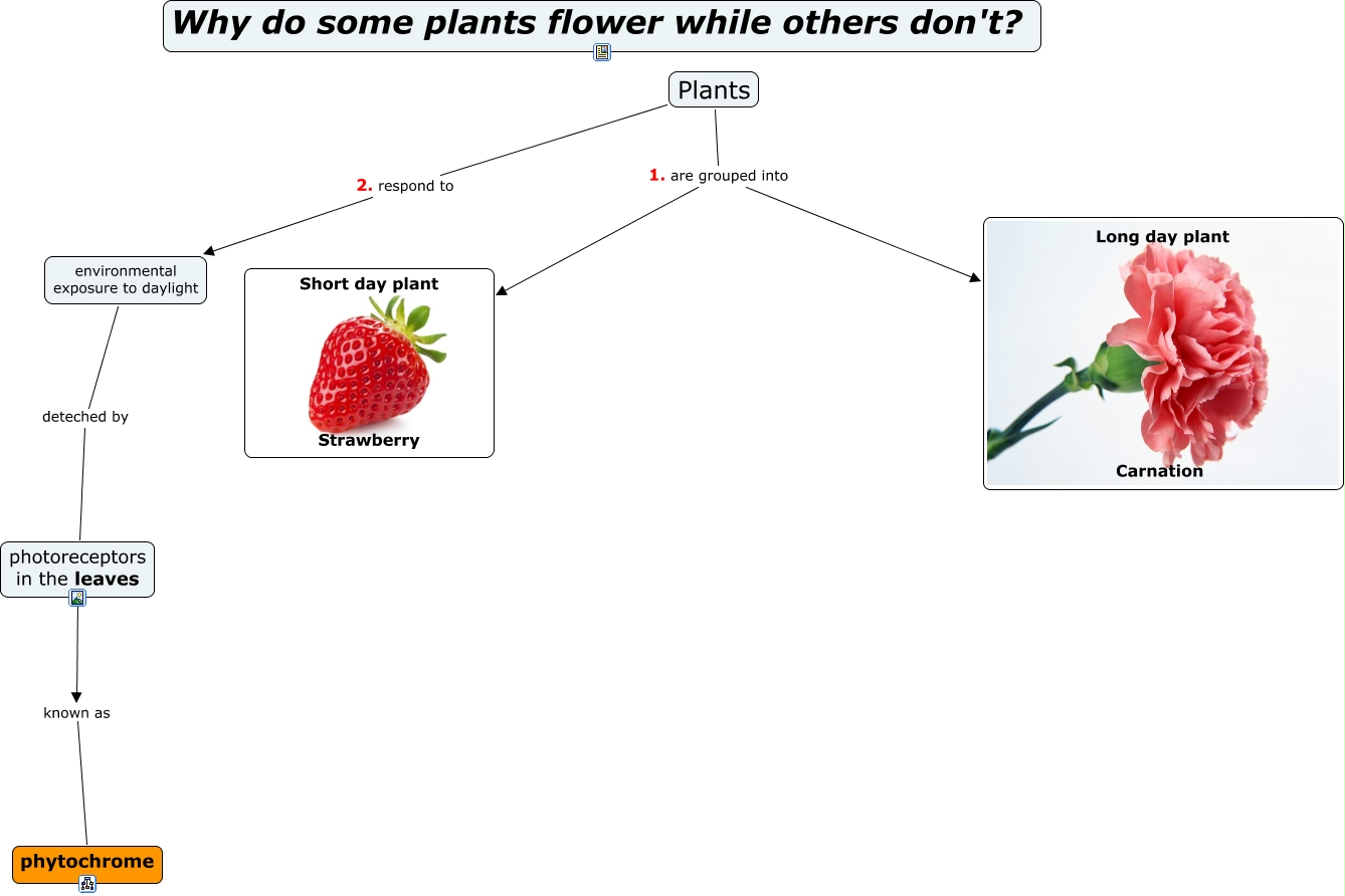 This Concept Map, created with IHMC CmapTools, has information related to: 1 Two groups of plants (Presentation), photoreceptors in the leaves known as phytochrome, Plants 1. are grouped into Short day plant Strawberry, environmental exposure to daylight deteched by photoreceptors in the leaves, Plants 1. are grouped into Long day plant Carnation, Plants 2. respond to environmental exposure to daylight