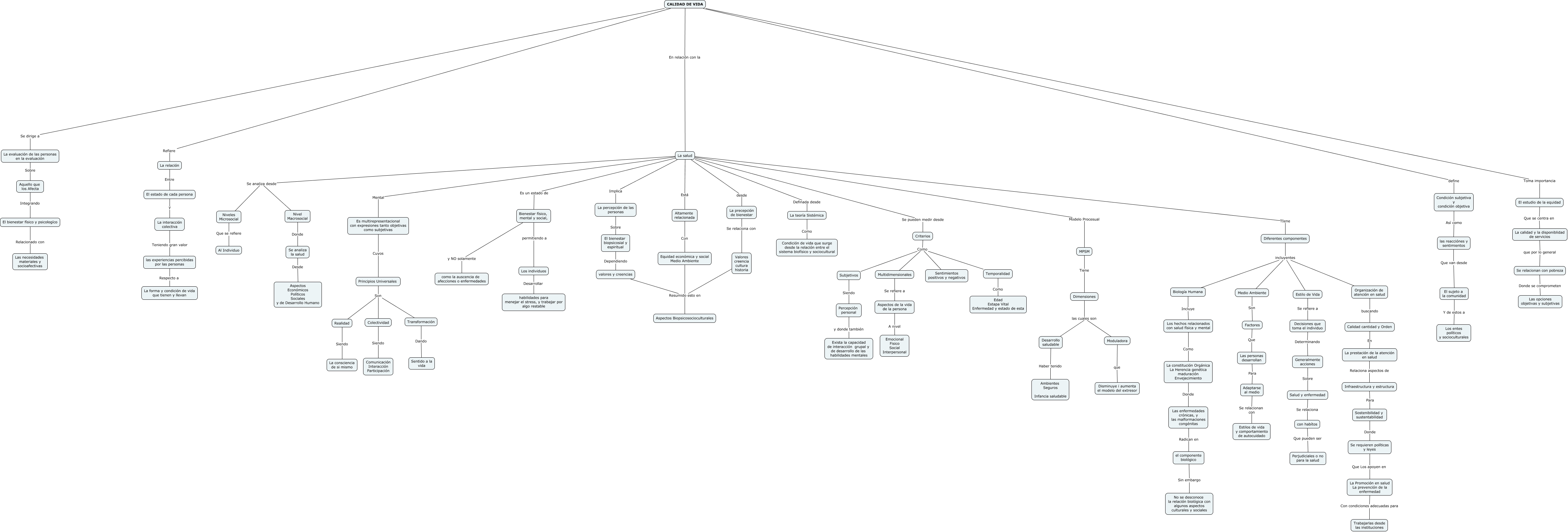 Este Cmap, tiene información relacionada con: calidad de vida, Criterios Como Multidimensionales, con habítos Que pueden ser Perjudiciales o no para la salud, La percepción de las personas Sobre El bienestar biopsicosial y espiritual, Bienestar físico, mental y social, y NO solamente como la auscencia de afecciones o enfermedades, Criterios Como Temporalidad, CALIDAD DE VIDA Refiere La relación, La salud Definada desde La teoría Sistémica, Percepción personal y donde también Exista la capacidad de interacción grupal y de desarrollo de las habilidades mentales, Nivel Macrosocial Donde Se analiza la salud, Equidad económica y social Medio Ambiente Resumido esto en Aspectos Biopsicosocioculturales, La salud Mental Es multirepresentacional con expresiones tanto objetivas como subjetivas, Subjetivos Siendo Percepción personal, Principios Universales Son Realidad, Calidad cantidad y Orden En La prestación de la atención en salud, Colectividad Siendo Comunicación Interacción Participación, La salud desde La precepción de bienestar, Decisiones que toma el individuo Se refiere a Estilo de Vida, Diferentes componentes incluyentes Medio Ambiente, Diferentes componentes incluyentes Biología Humana, Multidimensionales Se refiere a Aspectos de la vida de la persona