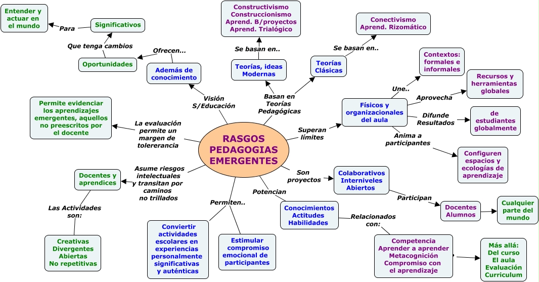 Este Cmap, tiene información relacionada con: PEDAGOGIAS EMERGENTES 3, RASGOS PEDAGOGIAS EMERGENTES Superan límites Físicos y organizacionales del aula, Físicos y organizacionales del aula Une.. Contextos: formales e informales, Competencia Aprender a aprender Metacognición Compromiso con el aprendizaje ???? Más allá: Del curso El aula Evaluación Curriculum, Físicos y organizacionales del aula Anima a participantes Configuren espacios y ecologías de aprendizaje, Oportunidades Que tenga cambios Significativos, Teorías Clásicas Se basan en.. Conectivismo Aprend. Rizomático, Docentes y aprendices Las Actividades son: Creativas Divergentes Abiertas No repetitivas, RASGOS PEDAGOGIAS EMERGENTES Asume riesgos intelectuales y transitan por caminos no trillados Docentes y aprendices, Físicos y organizacionales del aula Aprovecha Recursos y herramientas globales, RASGOS PEDAGOGIAS EMERGENTES Visión S/Educación Además de conocimiento, RASGOS PEDAGOGIAS EMERGENTES Basan en Teorías Pedagógicas Teorías Clásicas, Teorías, ideas Modernas Se basan en.. Constructivismo Construccionismo Aprend. B/proyectos Aprend. Trialógico, Además de conocimiento Ofrecen... Oportunidades, RASGOS PEDAGOGIAS EMERGENTES Son proyectos Colaborativos Interniveles Abiertos, RASGOS PEDAGOGIAS EMERGENTES Potencian Conocimientos Actitudes Habilidades, RASGOS PEDAGOGIAS EMERGENTES La evaluación permite un margen de tolererancia Permite evidenciar los aprendizajes emergentes, aquellos no preescritos por el docente, Colaborativos Interniveles Abiertos Participan Docentes Alumnos, Significativos Para Entender y actuar en el mundo, Conocimientos Actitudes Habilidades Relacionados con: Competencia Aprender a aprender Metacognición Compromiso con el aprendizaje, Docentes Alumnos ???? Cualquier parte del mundo