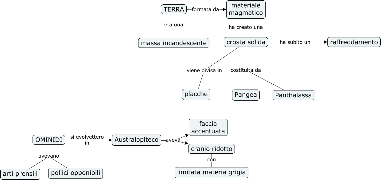 Questa Cmap, creata con IHMC CmapTools, contiene informazioni relative a: Origine della Terra, crosta solida costituita da Panthalassa, Australopiteco aveva cranio ridotto, OMINIDI si evolvettero in Australopiteco, Australopiteco aveva faccia accentuata, cranio ridotto con limitata materia grigia, OMINIDI avevano arti prensili, crosta solida viene divisa in placche, OMINIDI avevano pollici opponibili, materiale magmatico ha creato una crosta solida, crosta solida costituita da Pangea, TERRA formata da materiale magmatico, crosta solida ha subito un raffreddamento, TERRA era una massa incandescente