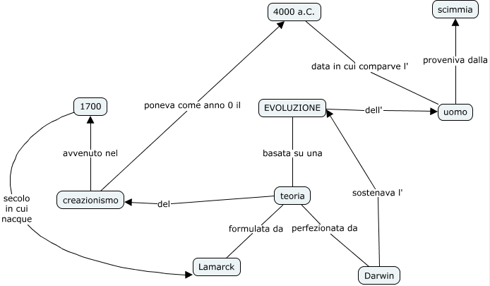 Questa Cmap, creata con IHMC CmapTools, contiene informazioni relative a: gruppo 4, 1700 secolo in cui nacque Lamarck, 4000 a.C. data in cui comparve l' uomo, creazionismo poneva come anno 0 il 4000 a.C., EVOLUZIONE dell' uomo, teoria formulata da Lamarck, teoria perfezionata da Darwin, uomo proveniva dalla scimmia, teoria del creazionismo, EVOLUZIONE basata su una teoria, Darwin sostenava l' EVOLUZIONE, creazionismo avvenuto nel 1700