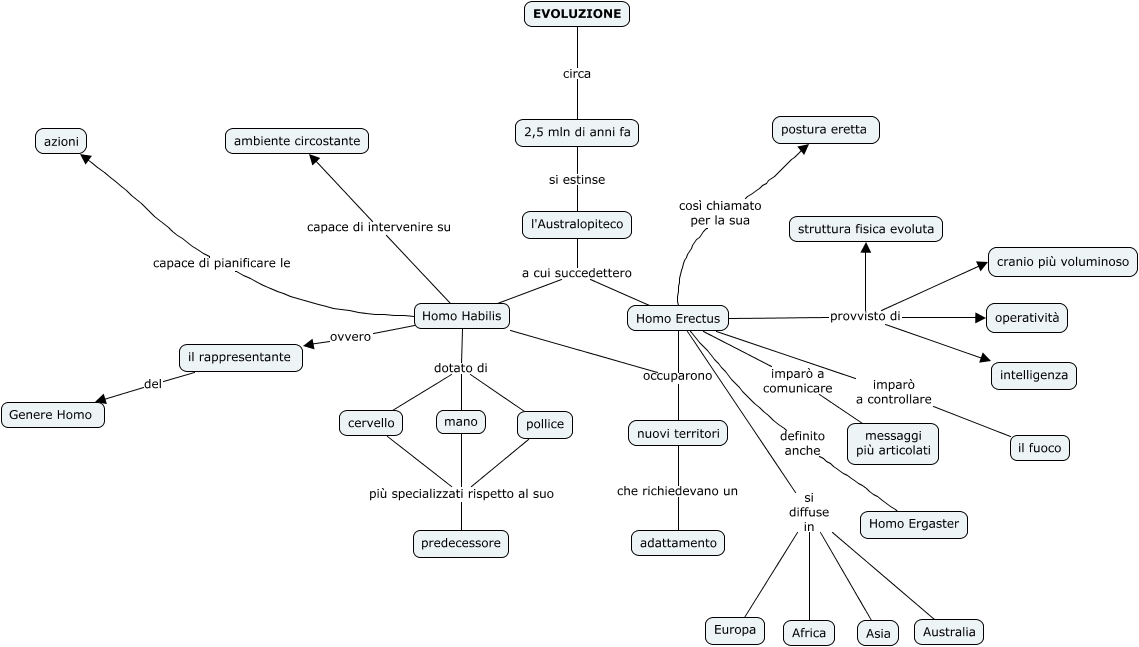 Questa Cmap, creata con IHMC CmapTools, contiene informazioni relative a: gruppo 5, Homo Erectus così chiamato per la sua postura eretta, Homo Habilis capace di intervenire su ambiente circostante, mano più specializzati rispetto al suo predecessore, 2,5 mln di anni fa si estinse l'Australopiteco, l'Australopiteco a cui succedettero Homo Erectus, Homo Habilis dotato di cervello, Homo Habilis capace di pianificare le azioni, il rappresentante del Genere Homo, nuovi territori che richiedevano un adattamento, Homo Erectus imparò a comunicare messaggi più articolati, pollice più specializzati rispetto al suo predecessore, cervello più specializzati rispetto al suo predecessore, Homo Erectus provvisto di struttura fisica evoluta, Homo Erectus imparò a controllare il fuoco, Homo Erectus provvisto di intelligenza, EVOLUZIONE circa 2,5 mln di anni fa, Homo Erectus provvisto di cranio più voluminoso, Homo Habilis ovvero il rappresentante, Homo Erectus si diffuse in Asia, Homo Habilis occuparono nuovi territori