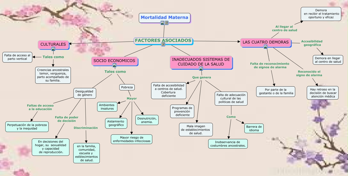 Este Cmap, tiene información relacionada con: Mortalidad Materna, INADECUADOS SISTEMAS DE CUIDADO DE LA SALUD Que genera Falta de adecuación cultural de las politicas de salud, Desigualdad de género Falta de poder de decisión En decisiones del hogar, su sexualidad y capacidad de reproducción., CULTURALES Tales como Falta de acceso al parto vertical, Mortalidad Materna FACTORES ASOCIADOS LAS CUATRO DEMORAS, LAS CUATRO DEMORAS Falta de reconocimiento de signos de alarma Por parte de la gestante o de la familia, SOCIO ECONOMICOS Tales como Desigualdad de género, Pobreza Mayor Ambientes insalures, INADECUADOS SISTEMAS DE CUIDADO DE LA SALUD Que genera Mala imagen de establecimientos de salud., CULTURALES Tales como Creencias ancestrales temor, verguenza, parto acompañado de su familia., SOCIO ECONOMICOS Tales como Pobreza, LAS CUATRO DEMORAS Accesibilidad geográfica Demora en llegar al centro de salud, Pobreza Mayor Desnutrición, anemia., Desigualdad de género Discriminación en la familia, comunidad, escuela y estblecimientos de salud., Mortalidad Materna FACTORES ASOCIADOS CULTURALES, LAS CUATRO DEMORAS Reconocido el signo de alarma Hay retraso en la decisión de buscar atención médica, Pobreza Mayor Mayor riesgo de enfermedades infecciosas, Pobreza Mayor Aislamiento geográfico, Mortalidad Materna FACTORES ASOCIADOS SOCIO ECONOMICOS, Mortalidad Materna FACTORES ASOCIADOS INADECUADOS SISTEMAS DE CUIDADO DE LA SALUD, Falta de adecuación cultural de las politicas de salud Como Inobservancia de costumbres ancestrales.
