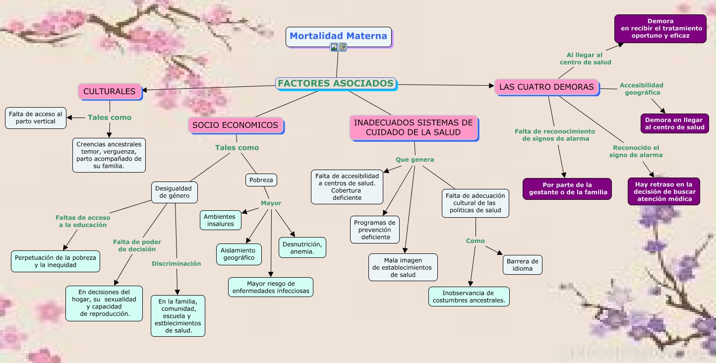 Este Cmap, tiene información relacionada con: Sin Título, Desigualdad de género Falta de poder de decisión En decisiones del hogar, su sexualidad y capacidad de reproducción., INADECUADOS SISTEMAS DE CUIDADO DE LA SALUD Que genera Falta de adecuación cultural de las politicas de salud, CULTURALES Tales como Falta de acceso al parto vertical, Mortalidad Materna FACTORES ASOCIADOS LAS CUATRO DEMORAS, LAS CUATRO DEMORAS Falta de reconocimiento de signos de alarma Por parte de la gestante o de la familia, Pobreza Mayor Ambientes insalures, SOCIO ECONOMICOS Tales como Desigualdad de género, INADECUADOS SISTEMAS DE CUIDADO DE LA SALUD Que genera Mala imagen de establecimientos de salud, Falta de adecuación cultural de las politicas de salud Como Barrera de idioma, CULTURALES Tales como Creencias ancestrales temor, verguenza, parto acompañado de su familia., SOCIO ECONOMICOS Tales como Pobreza, LAS CUATRO DEMORAS Accesibilidad geográfica Demora en llegar al centro de salud, Pobreza Mayor Desnutrición, anemia., Desigualdad de género Discriminación En la familia, comunidad, escuela y estblecimientos de salud., Mortalidad Materna FACTORES ASOCIADOS CULTURALES, Pobreza Mayor Aislamiento geográfico, Pobreza Mayor Mayor riesgo de enfermedades infecciosas, Mortalidad Materna FACTORES ASOCIADOS SOCIO ECONOMICOS, LAS CUATRO DEMORAS Reconocido el signo de alarma Hay retraso en la decisión de buscar atención médica, Mortalidad Materna FACTORES ASOCIADOS INADECUADOS SISTEMAS DE CUIDADO DE LA SALUD