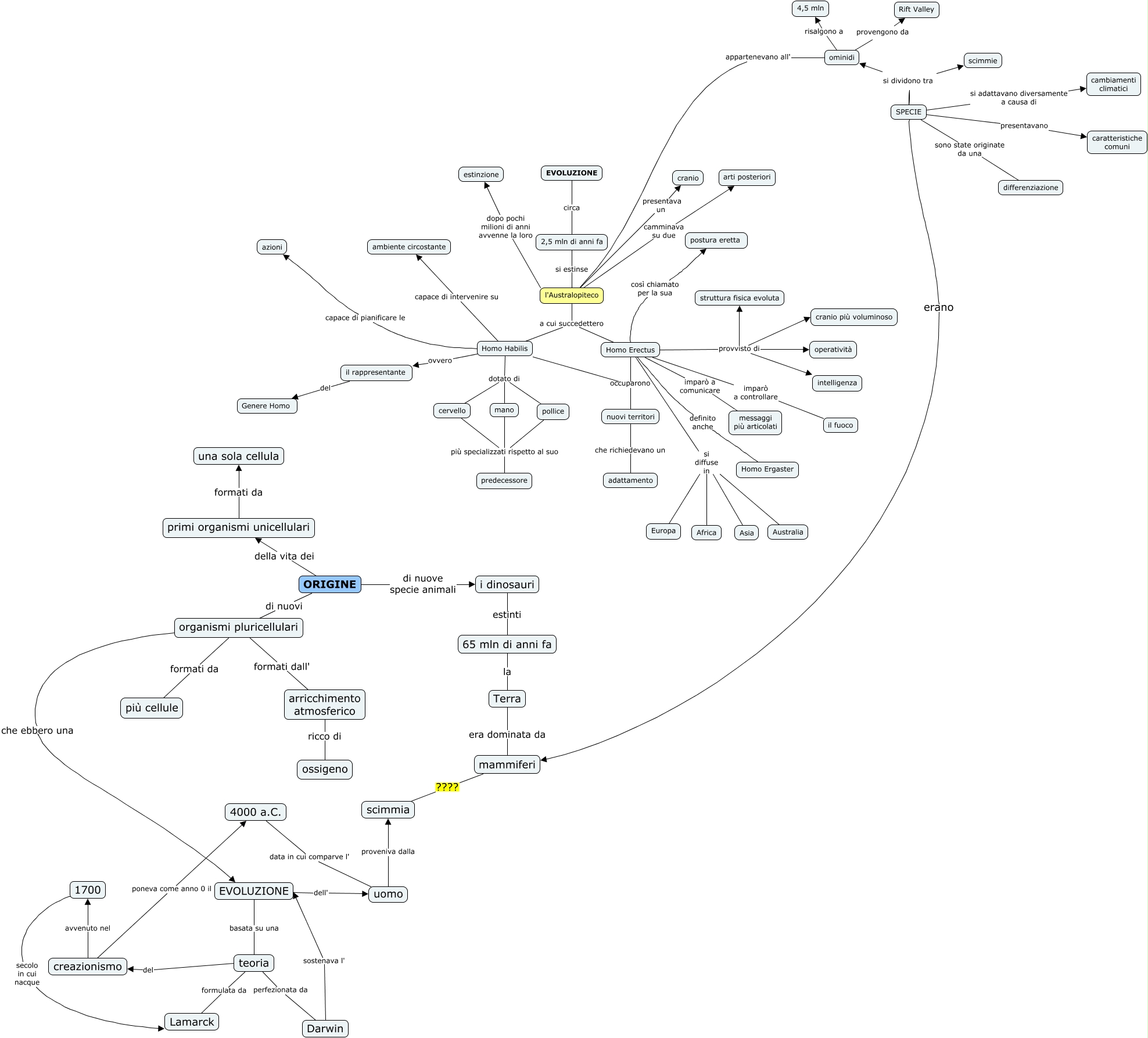 Questa Cmap, creata con IHMC CmapTools, contiene informazioni relative a: sintesi, creazionismo poneva come anno 0 il 4000 a.C., SPECIE erano mammiferi, organismi pluricellulari formati dall' arricchimento atmosferico, organismi pluricellulari che ebbero una EVOLUZIONE, Terra era dominata da mammiferi, teoria del creazionismo, l'Australopiteco a cui succedettero Homo Habilis, Homo Erectus si diffuse in Africa, organismi pluricellulari formati da più cellule, 1700 secolo in cui nacque Lamarck, SPECIE sono state originate da una differenziazione, Homo Erectus si diffuse in Europa, SPECIE si dividono tra scimmie, Darwin sostenava l' EVOLUZIONE, Homo Habilis ovvero il rappresentante, creazionismo avvenuto nel 1700, Homo Habilis occuparono nuovi territori, arricchimento atmosferico ricco di ossigeno, uomo proveniva dalla scimmia, nuovi territori che richiedevano un adattamento
