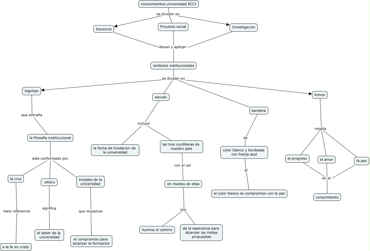 Este Cmap, tiene información relacionada con: conocimiento, Proyecto social llevan y aplican simbolos institucionales, logotipo que entraña la filosofia instituccional, las tres cordilleras de nuestro pais con el sol en medios de ellas, en medios de ellas nos da la esperanza para alcanzar las metas propuestas, el progreso en el conocimiento, Docencia llevan y aplican simbolos institucionales, Investigacion llevan y aplican simbolos institucionales, simbolos institucionales se dividen en escudo, conocimientos universidad ECCI se dividen en Docencia, la paz en el conocimiento, ellibro significa el saber de la universidad, la filosofia instituccional esta conformado por ellibro, escudo incluye las tres cordilleras de nuestro pais, el amor en el conocimiento, escudo incluye la fecha de fundacion de la universidad, la cruz hace referencia a la fe en cristo, conocimientos universidad ECCI se dividen en Investigacion, simbolos institucionales se dividen en bandera, himno resalta el progreso, conocimientos universidad ECCI se dividen en Proyecto social