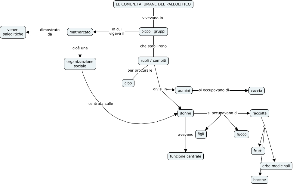 Questa Cmap, creata con IHMC CmapTools, contiene informazioni relative a: 4_Le comunità umane del Paleolitico, raccolta di frutti, donne avevano funzione centrale, raccolta di erbe medicinali, donne si occupavano di fuoco, matriarcato cioè una organizzazione sociale, donne si occupavano di figli, matriarcato dimostrato da veneri paleolitiche, piccoli gruppi in cui vigeva il matriarcato, ruoli / compiti divisi in donne, donne si occupavano di raccolta, piccoli gruppi che stabilirono ruoli / compiti, organizzazione sociale centrata sulle donne, ruoli / compiti divisi in uomini, LE COMUNITA' UMANE DEL PALEOLITICO vivevano in piccoli gruppi, ruoli / compiti per procurare cibo, uomini si occupavano di caccia, raccolta di bacche