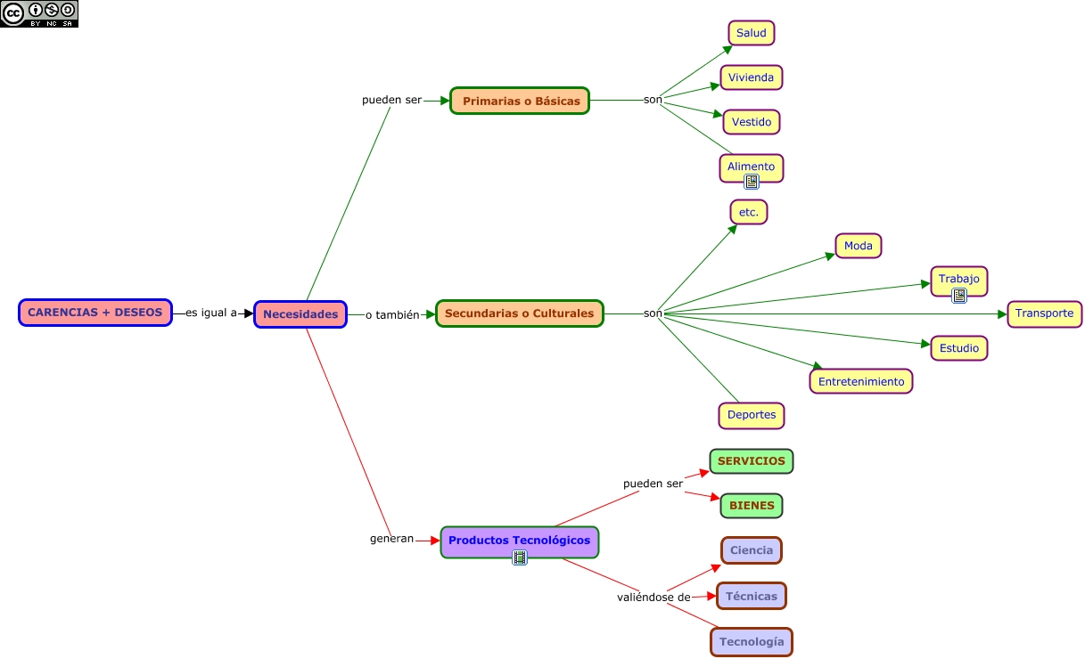 Este Cmap, tiene información relacionada con: TECNOLOGÍA-NECESIDADES 2, Primarias o Básicas son Alimento, Necesidades pueden ser Primarias o Básicas, CARENCIAS + DESEOS es igual a Necesidades, Productos Tecnológicos valiéndose de Tecnología, Primarias o Básicas son Vestido, Primarias o Básicas son Salud, Productos Tecnológicos pueden ser SERVICIOS, Secundarias o Culturales son Deportes, Secundarias o Culturales son Moda, Productos Tecnológicos valiéndose de Técnicas, Secundarias o Culturales son etc., Productos Tecnológicos pueden ser BIENES, Primarias o Básicas son Vivienda, Secundarias o Culturales son Trabajo, Secundarias o Culturales son Estudio, Secundarias o Culturales son Entretenimiento, Necesidades o también Secundarias o Culturales, Productos Tecnológicos valiéndose de Ciencia, Secundarias o Culturales son Transporte, Necesidades generan Productos Tecnológicos